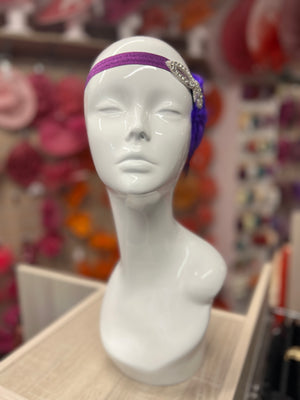 A vintage inspired 1920s headband finished with decorative diamante embellishment wispy purple feathers fixed on to an elastic purple glitter headband.