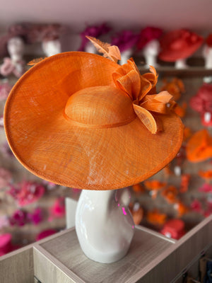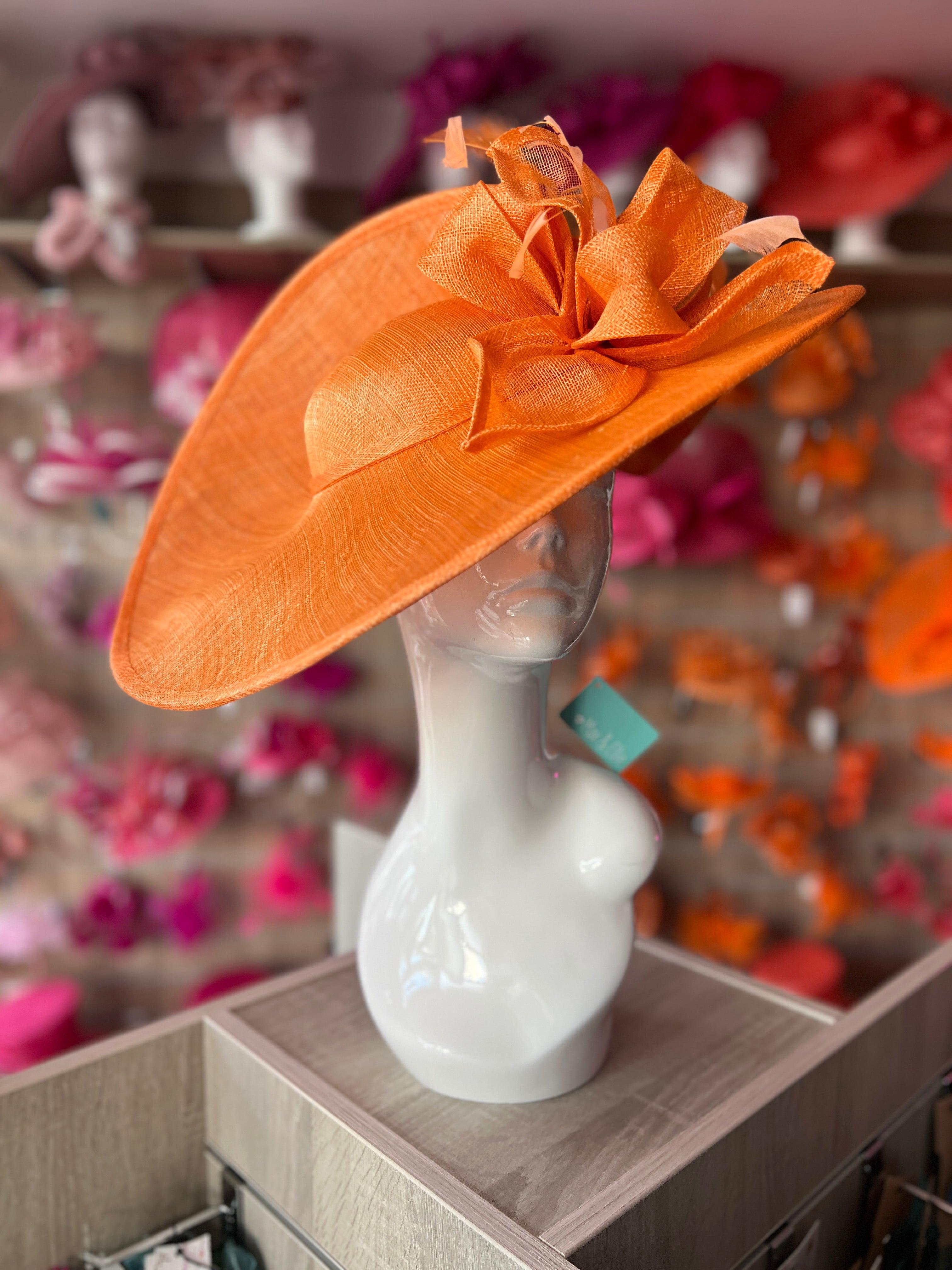 Worn on the head with a secure double wire headband, these glamorous large orange hatinators will add some drama to your occasionwear outfit