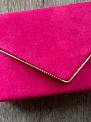 Get a chic new look with this fuchsia pink velvet clutch bag with gold trim designed for special occasions and weddings. Styled with fuchsia soft velvet, this classy pink clutch bag also includes a useful detachable chain shoulder strap.