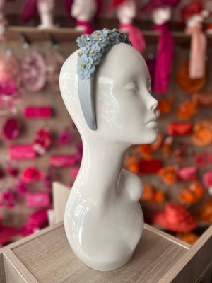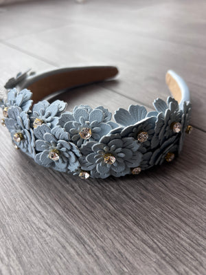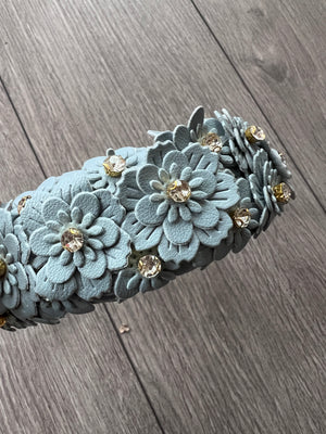 Our stunning cornflower blue headband with faux leather laser cut flowers and diamantés .