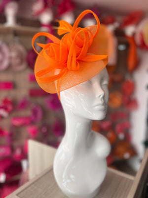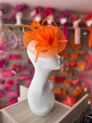 Our beautiful orange crinoline round saucer base fascinator with loops and feathers.