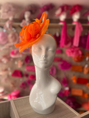 Oozing with elegance this stunning orange fascinator is fixed in place with a satin wrapped orange headband or a silver crocodile clip.
