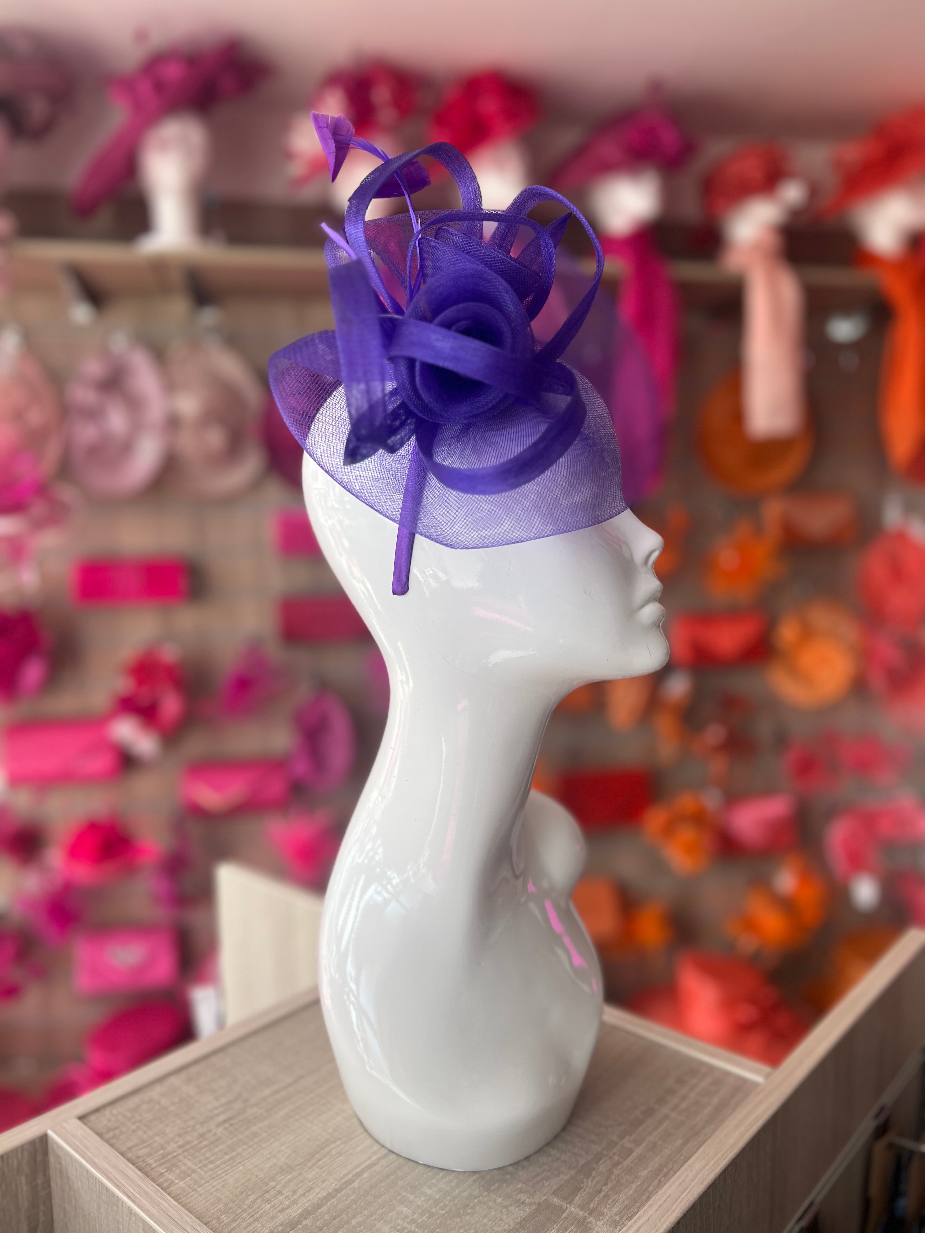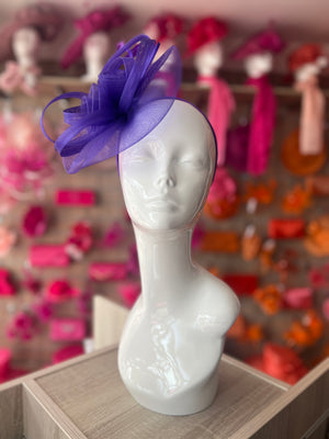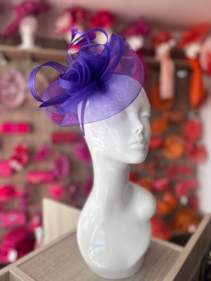 Our beautiful purple crinoline round saucer base fascinator with loops and feathers.
