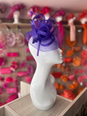 A classy purple fascinator in a contemporary design which is handcrafted from a crinoline disc base, trimmed with loops and feathers.