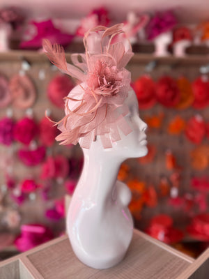 A medium size dusky pink hair fascinator designed with crinoline loops and decorated with loops and feathers in a flower design.