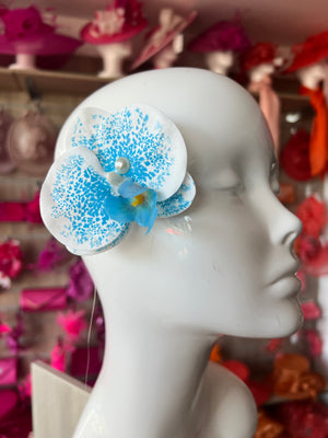 These sweet little hair orchids are perfect as a small wedding fascinator, these pretty blue and white orchid flowers simply clip into your hair and are ideal hair accessories for wedding guests, flower girls and bridesmaids but are also a fabulous hair accessory for festival hair and holiday hairstyles.