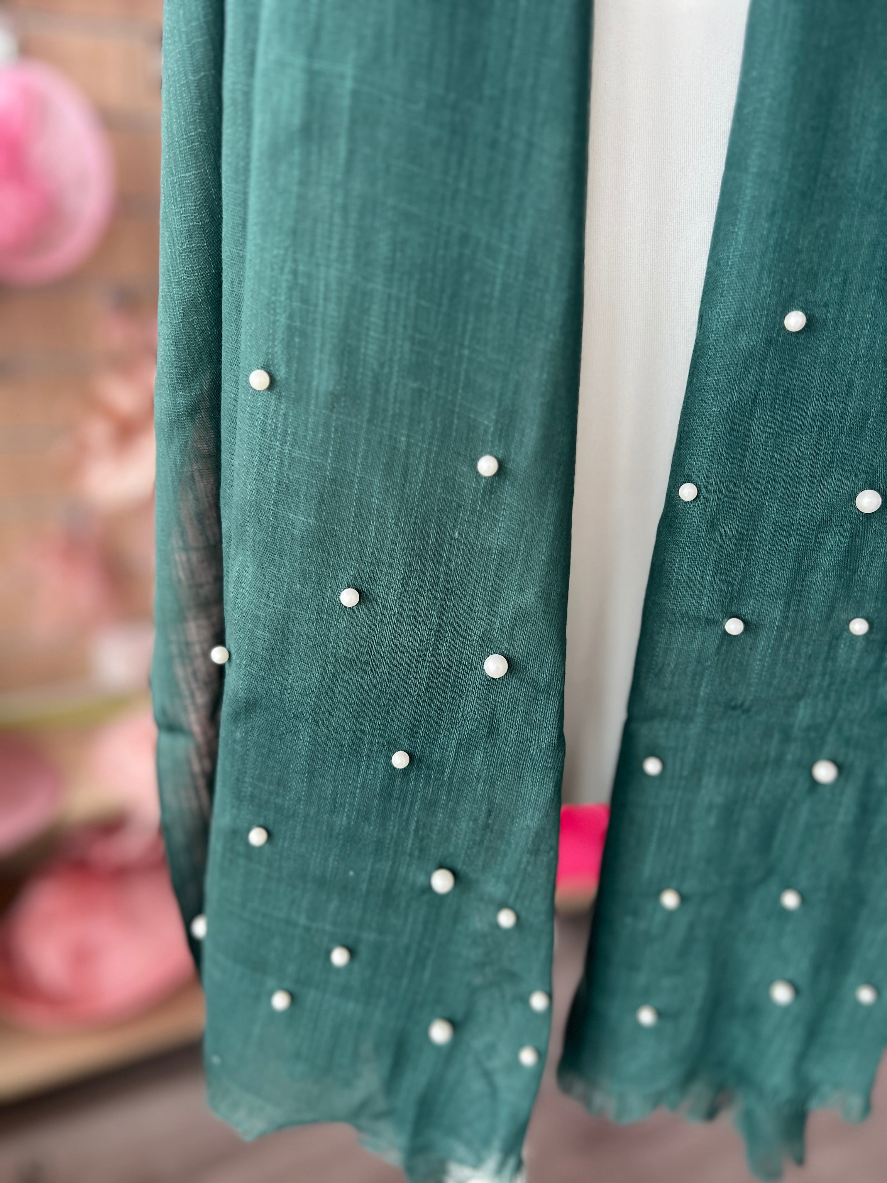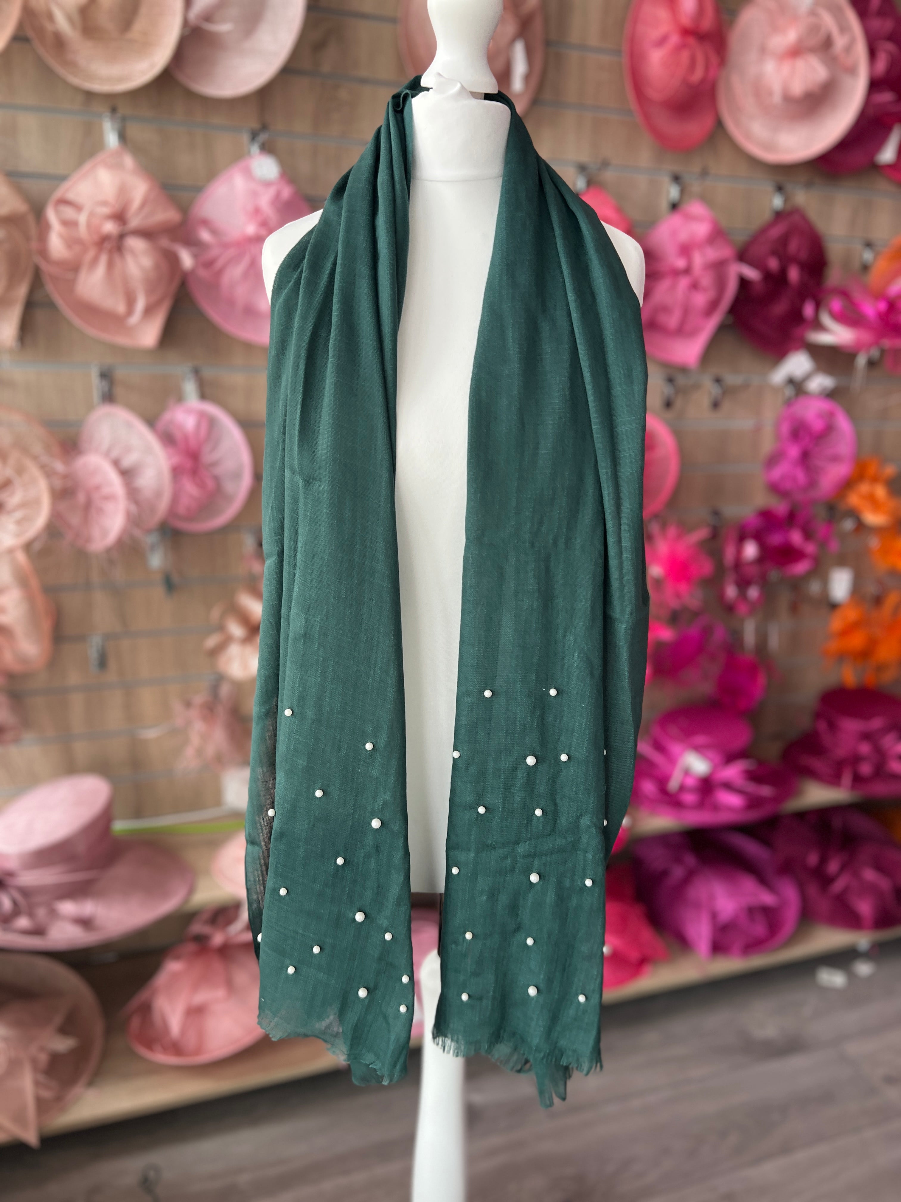 A timeless, elegant accompaniment to any look, our bottle green pashmina/scarf with faux pearl detail can be styled to suit formal looks or to elevate weekend ensembles.