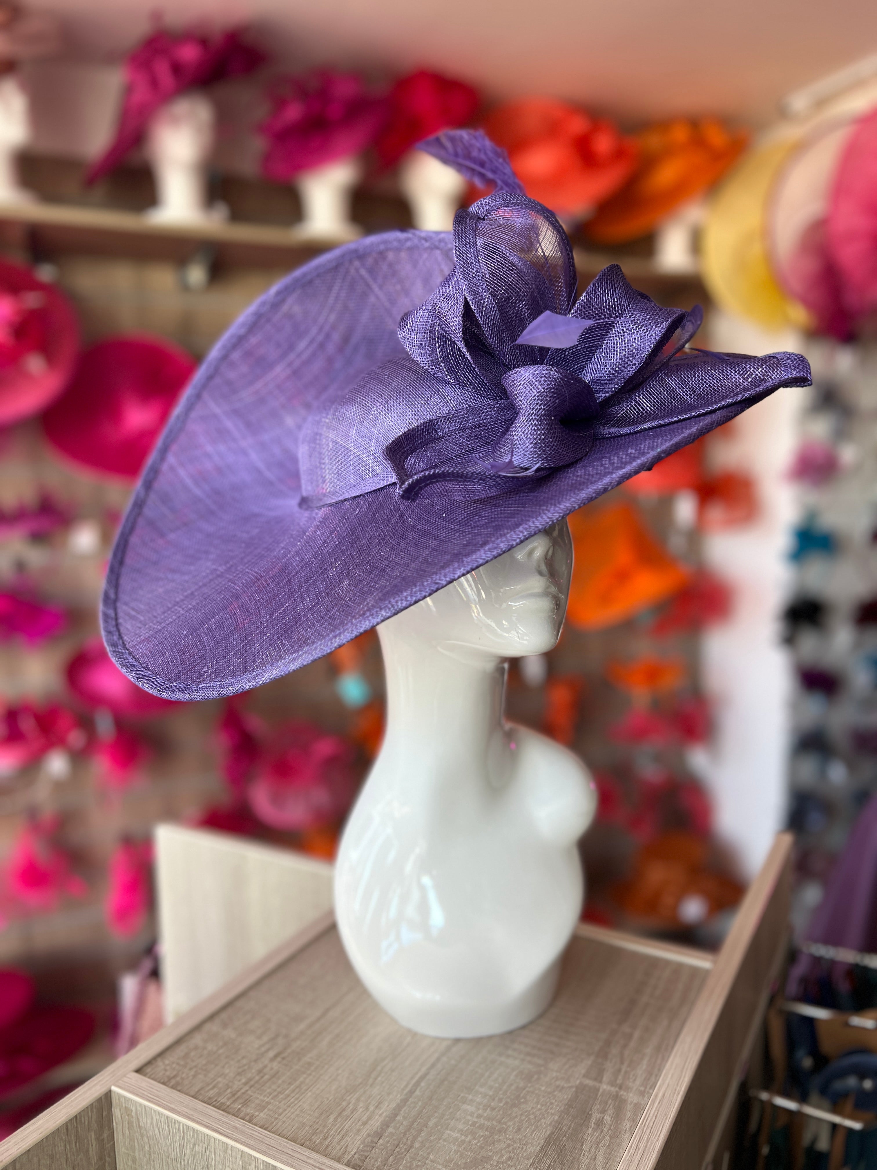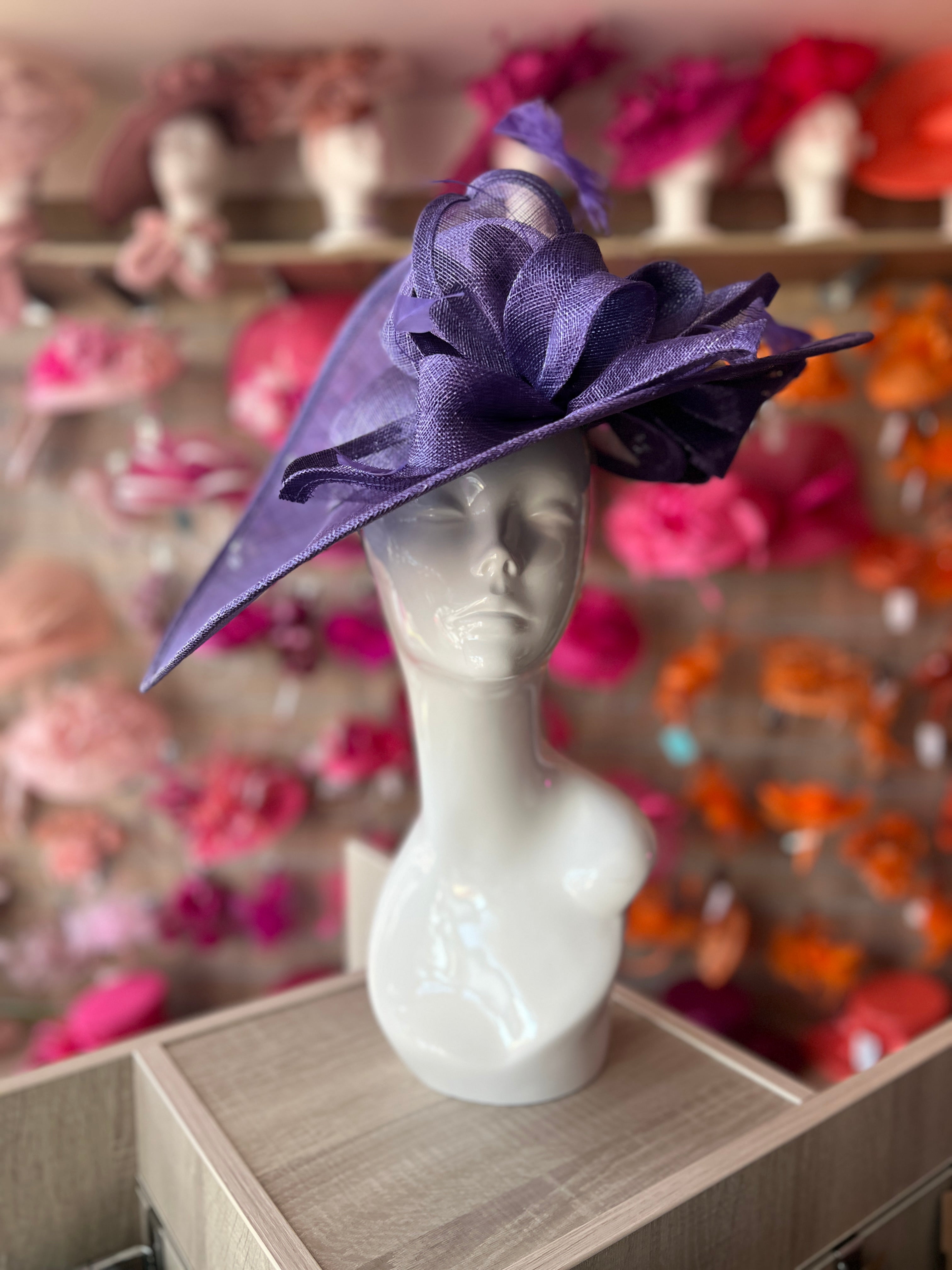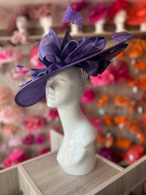 Finished with fine diamond cut coque feathers and beautifully fletched ostrich quills, this dramatic violet hatinator is the perfect headwear for an elegant race event such as Royal Ascot and also ideal as a large violet hatinator for weddings.