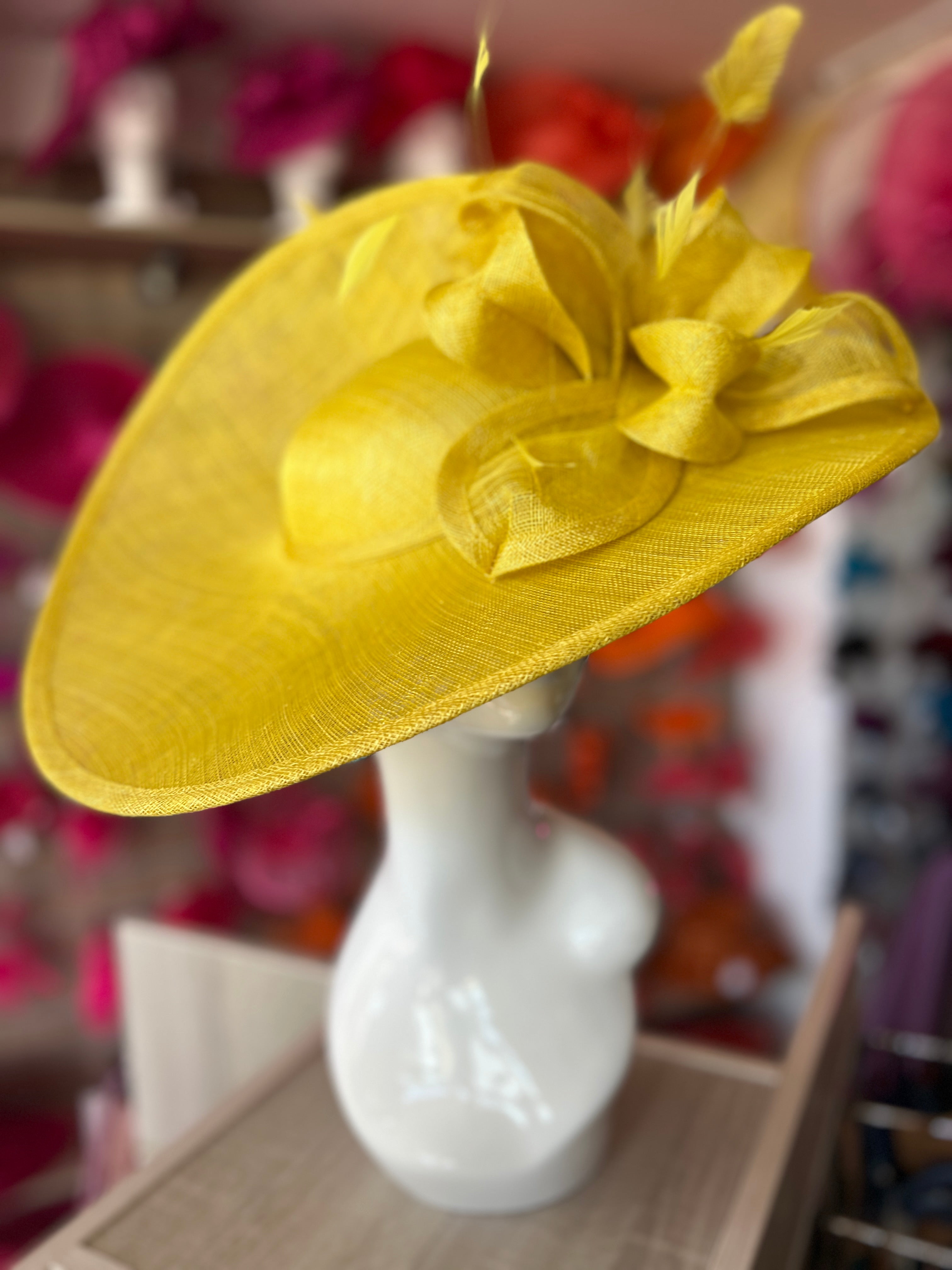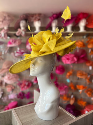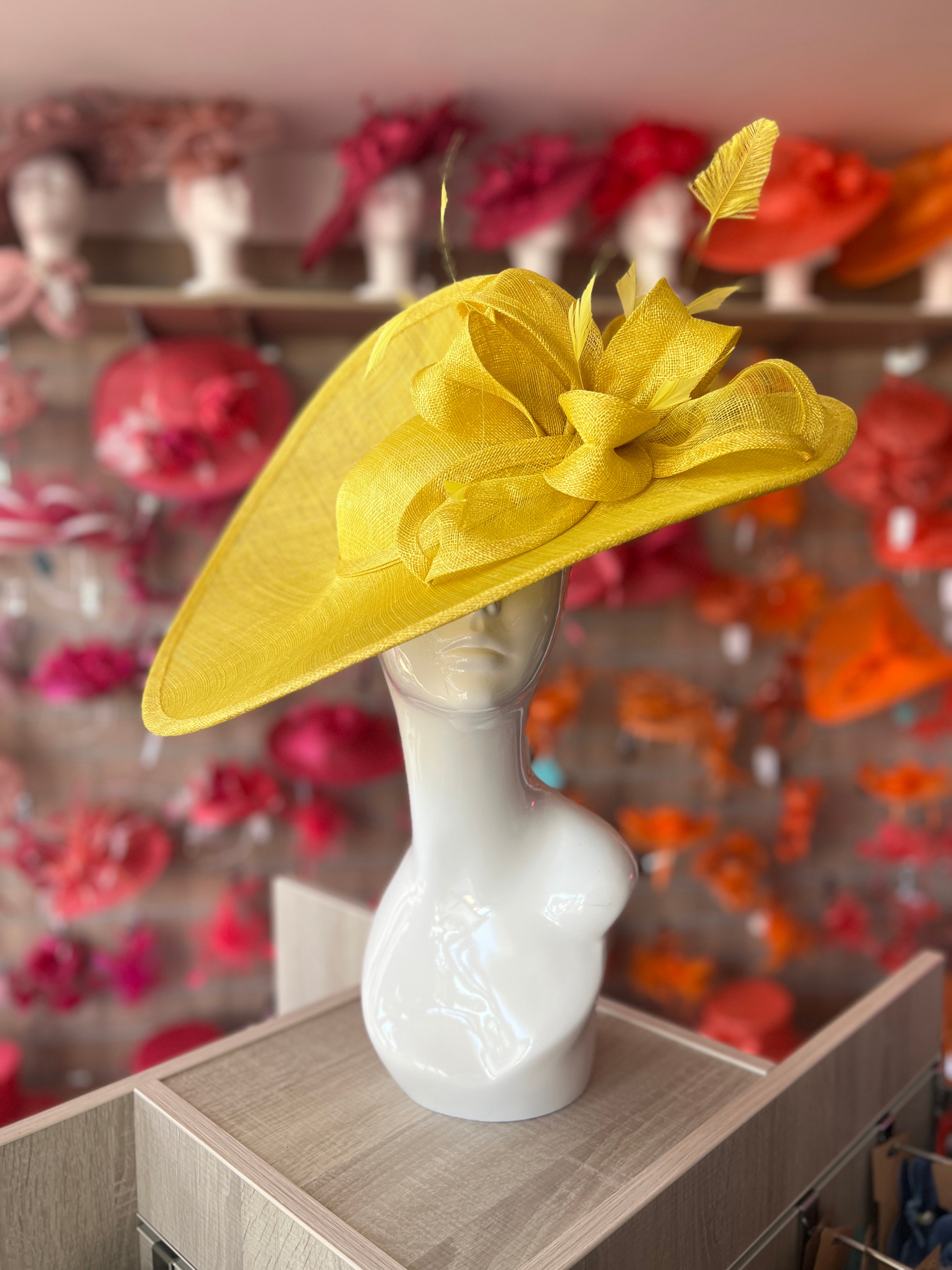 Worn on the head with a secure double wire headband, these glamorous large yellow hatinators will add some drama to your occasion wear outfit