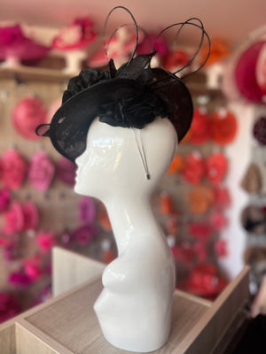 This dramatic black hatinator is the perfect headwear for an elegant race event such as Royal Ascot and also ideal as a black hatinator for weddings.