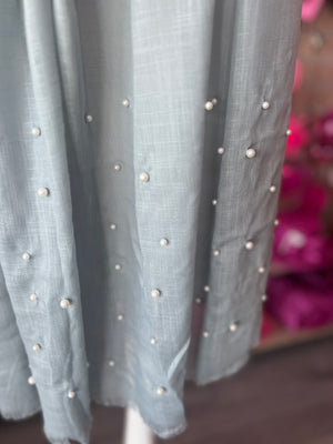 A timeless, elegant accompaniment to any look, our dusky blue pashmina/scarf with faux pearl detail can be styled to suit formal looks or to elevate weekend ensembles.