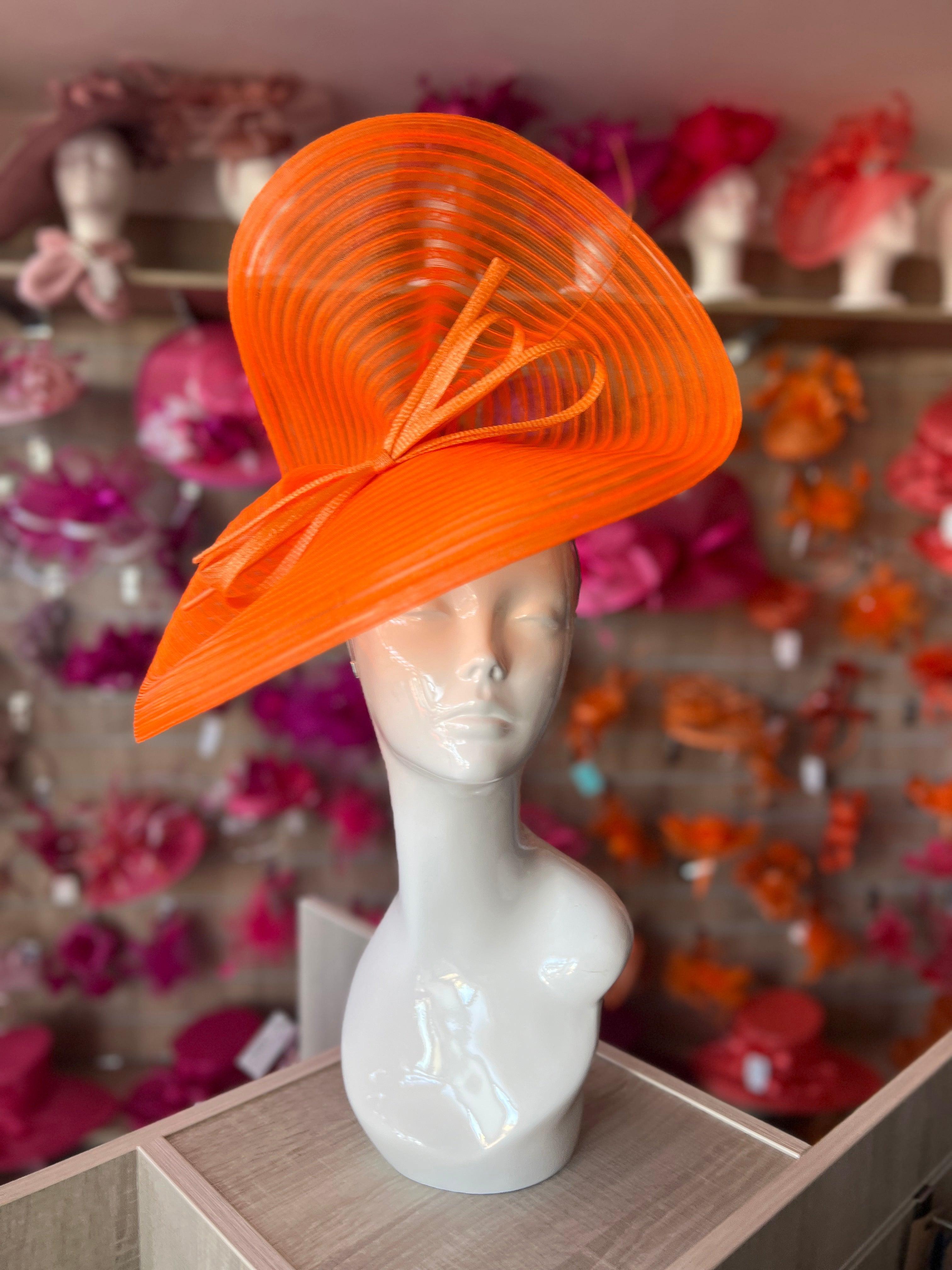 Statuesque and elegant, this large orange hatinator is simply divine! Crafted with a stitched crin fabric base, which has been expertly shaped into a uniquely styled headpiece.