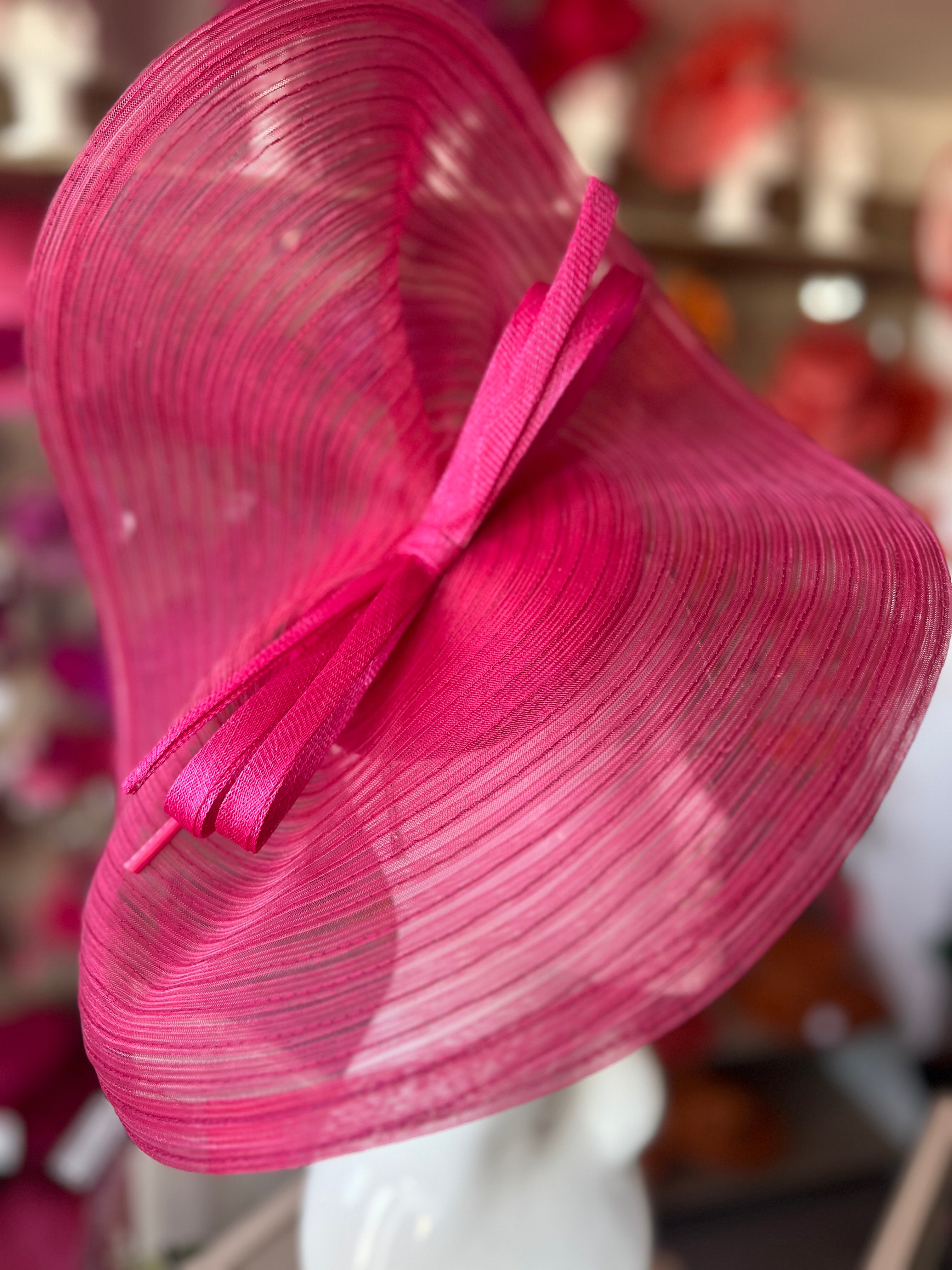 Statuesque and elegant, this large raspberry hatinator is simply divine! Crafted with a stitched crin fabric base, which has been expertly shaped into a uniquely styled headpiece.