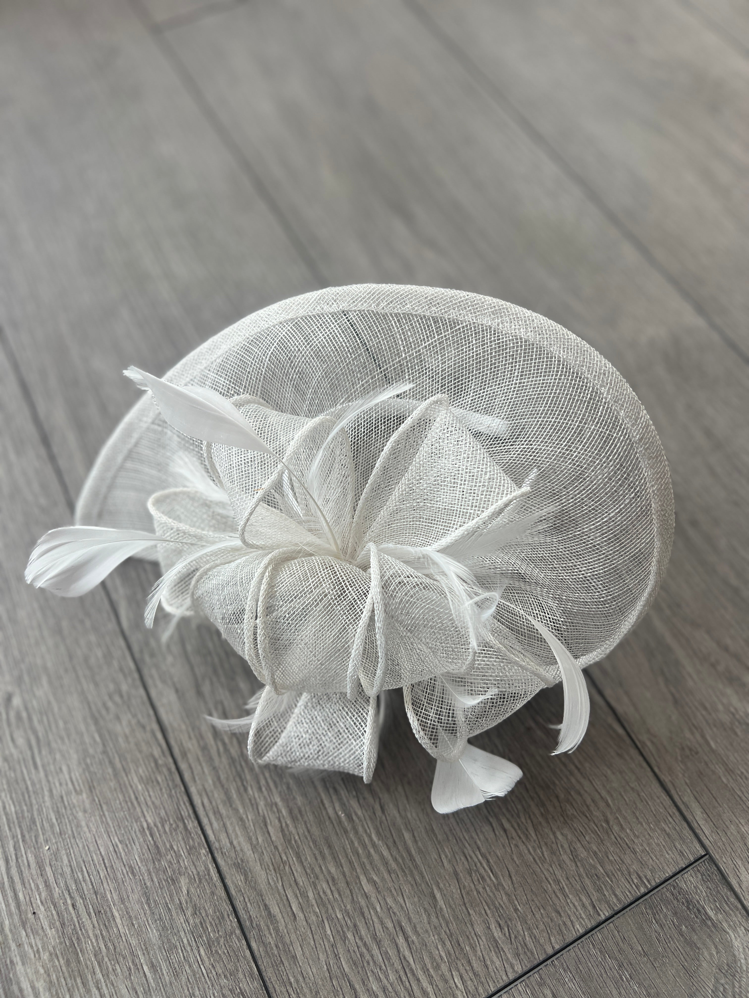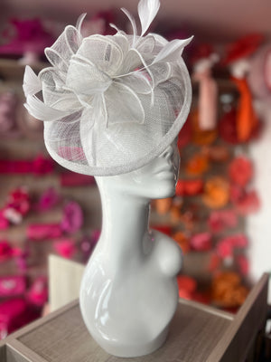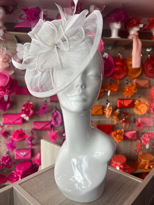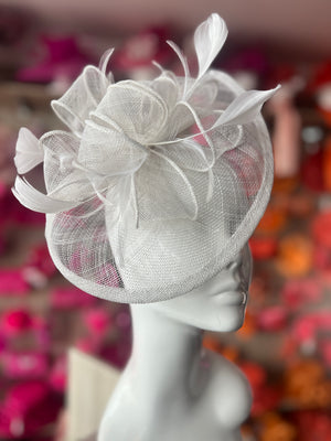 Add a touch of glamour to your occasion outfit with our stylish white fascinator designed with white sinamay, loops and feathers.