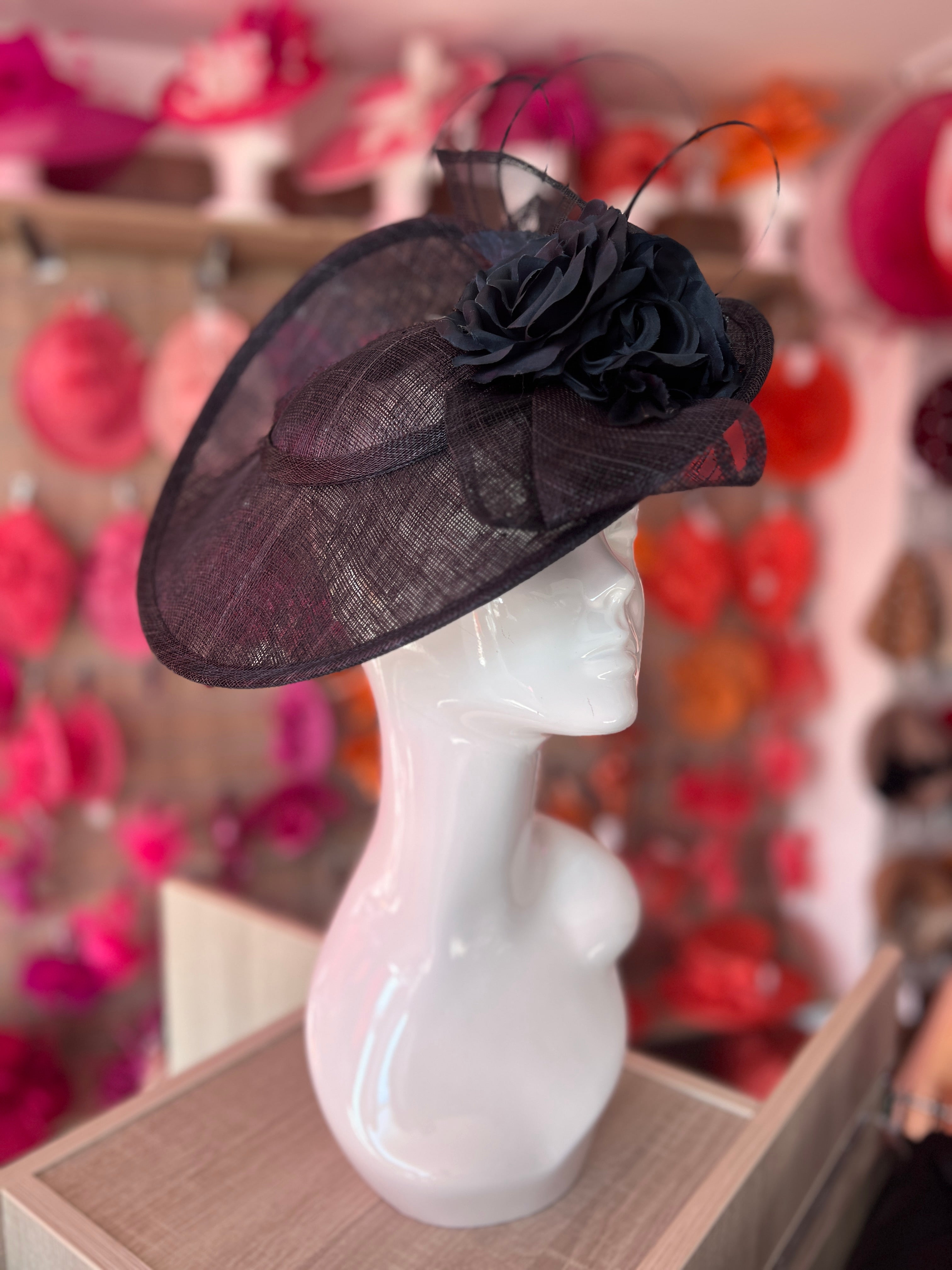 These show stopping navy hatinators are sure to turn heads with their impressive split brim which is perfectly proportioned sinamay bow sits atop the brim nestled among swilled quills and handcraftyed flowers, that also feature on the underbrim