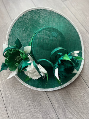 This stunning emerald/white/fern hat features sinamay loops and coils that lead you on a journey through a garden of goblet feather flowers on this superb boater style hat. In contrast to the curvaceous flowers, diamond shaped goose feathers reach out from the base to add a touch of height and style to this beautiful piece. Garden party or wedding, celebration or the races. This hat suits them all!