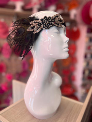 A stunning vintage flapper headpiece made with peacock feathers mounted on an elastic glitter headband with a large beaded embellishment.
