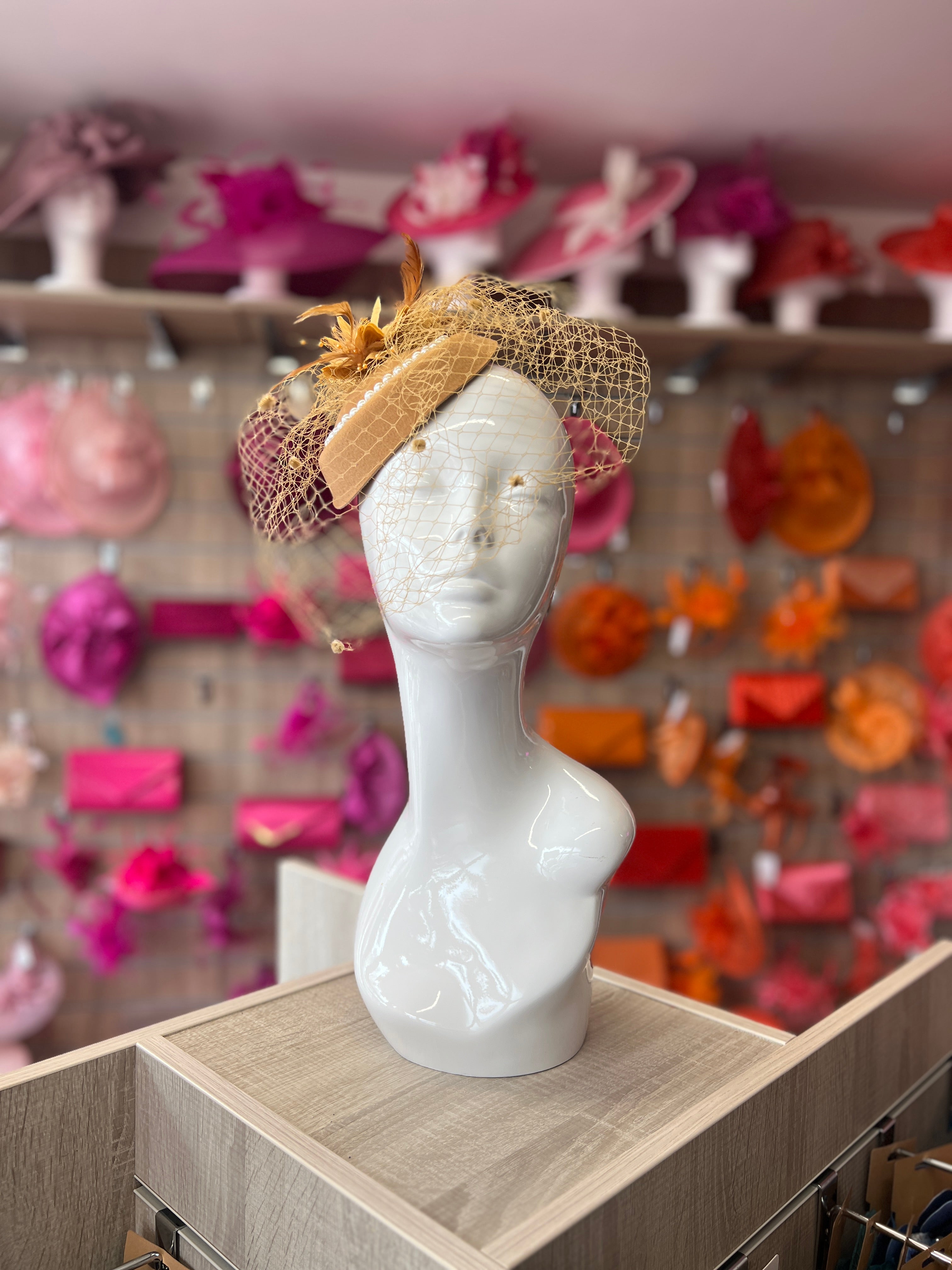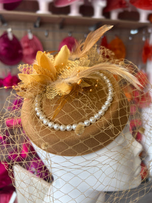 A simple yet elegant pillbox shape gold fascinator hat which can be worn for weddings and occasions.