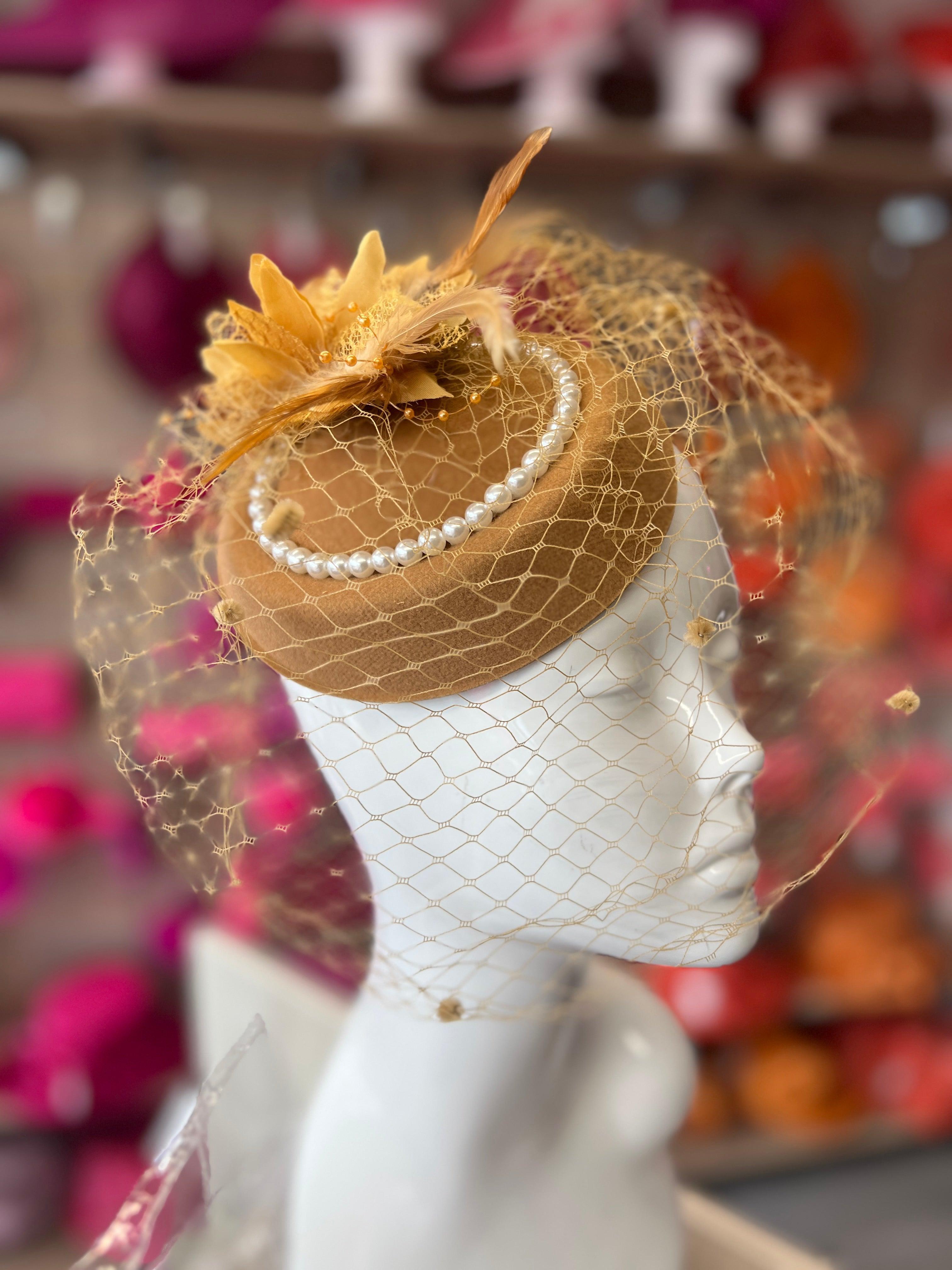 Designed with a felt pillbox hat base trimmed with a satin gold flower,faux pearls and decorative veil with chenille dots.