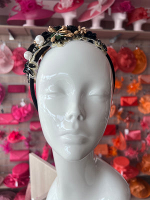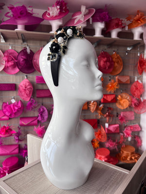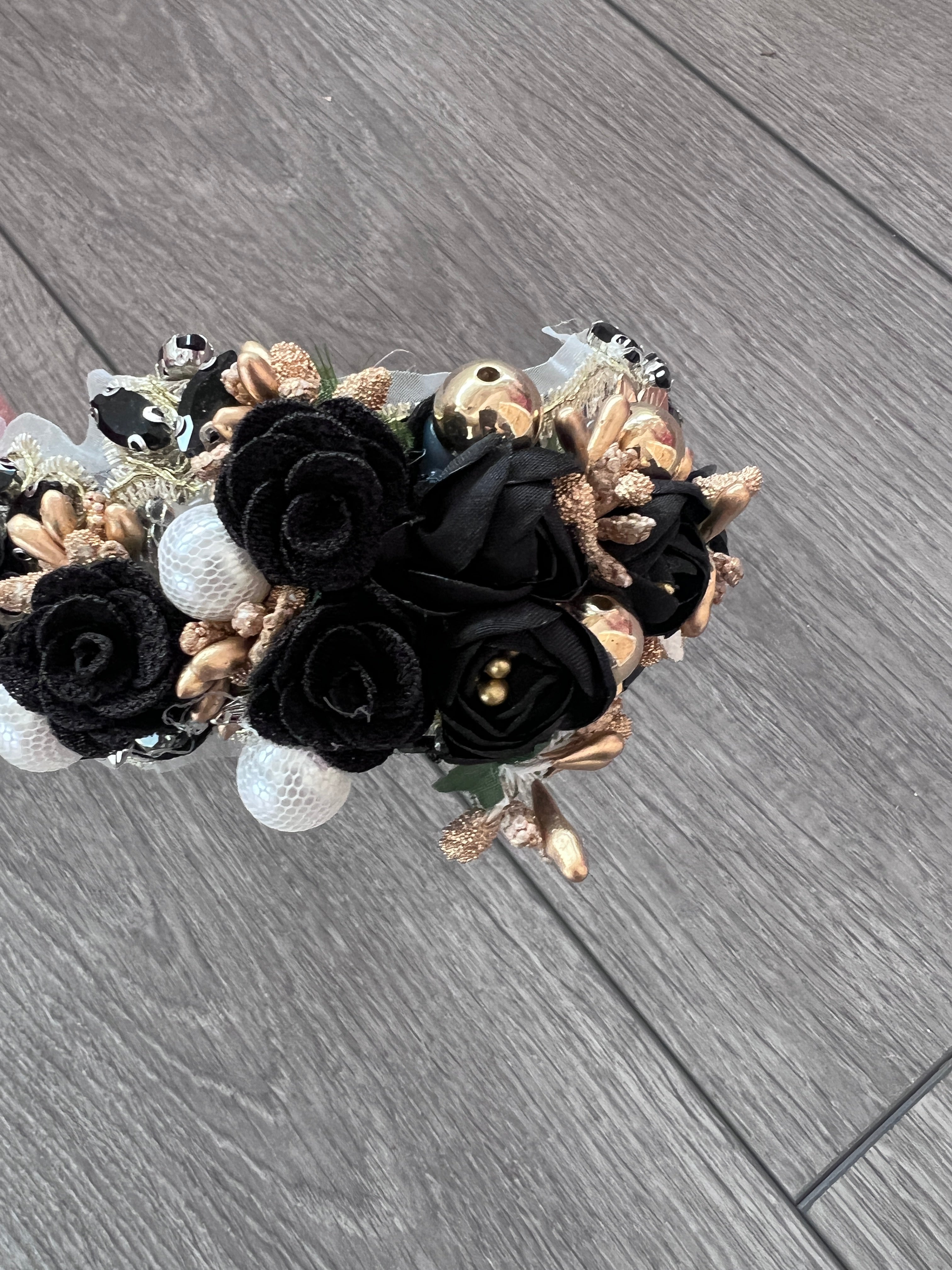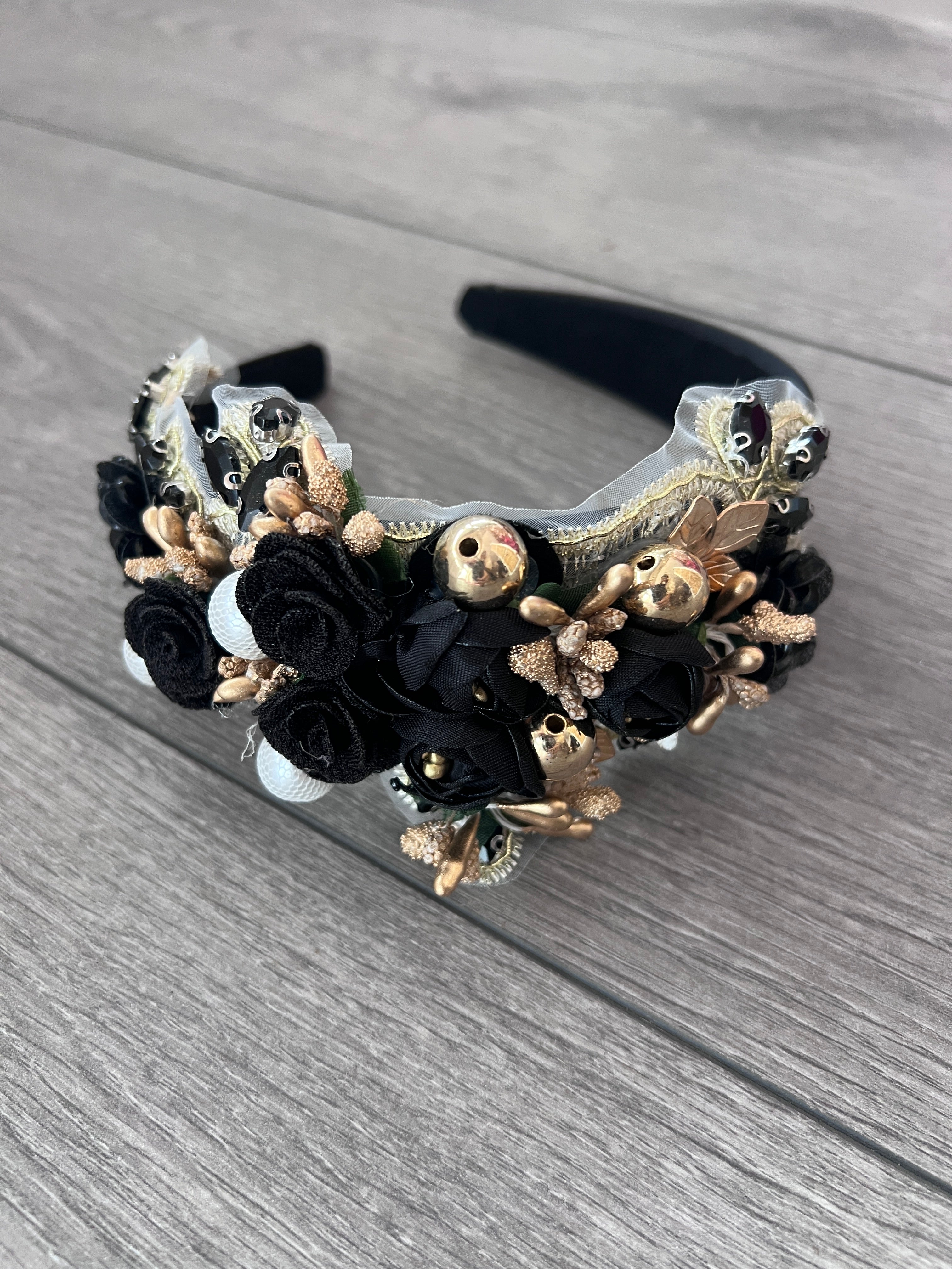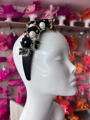 A black floral headband with dazzling crystals that will add some fabulous sparkle to any outfit. Decorated with fabric roses and large faux pearl and diamantes to add some glamour. This unique black headpiece would be perfect for a bide,bridesmaid or as a special occasion headband for a wedding or prom.