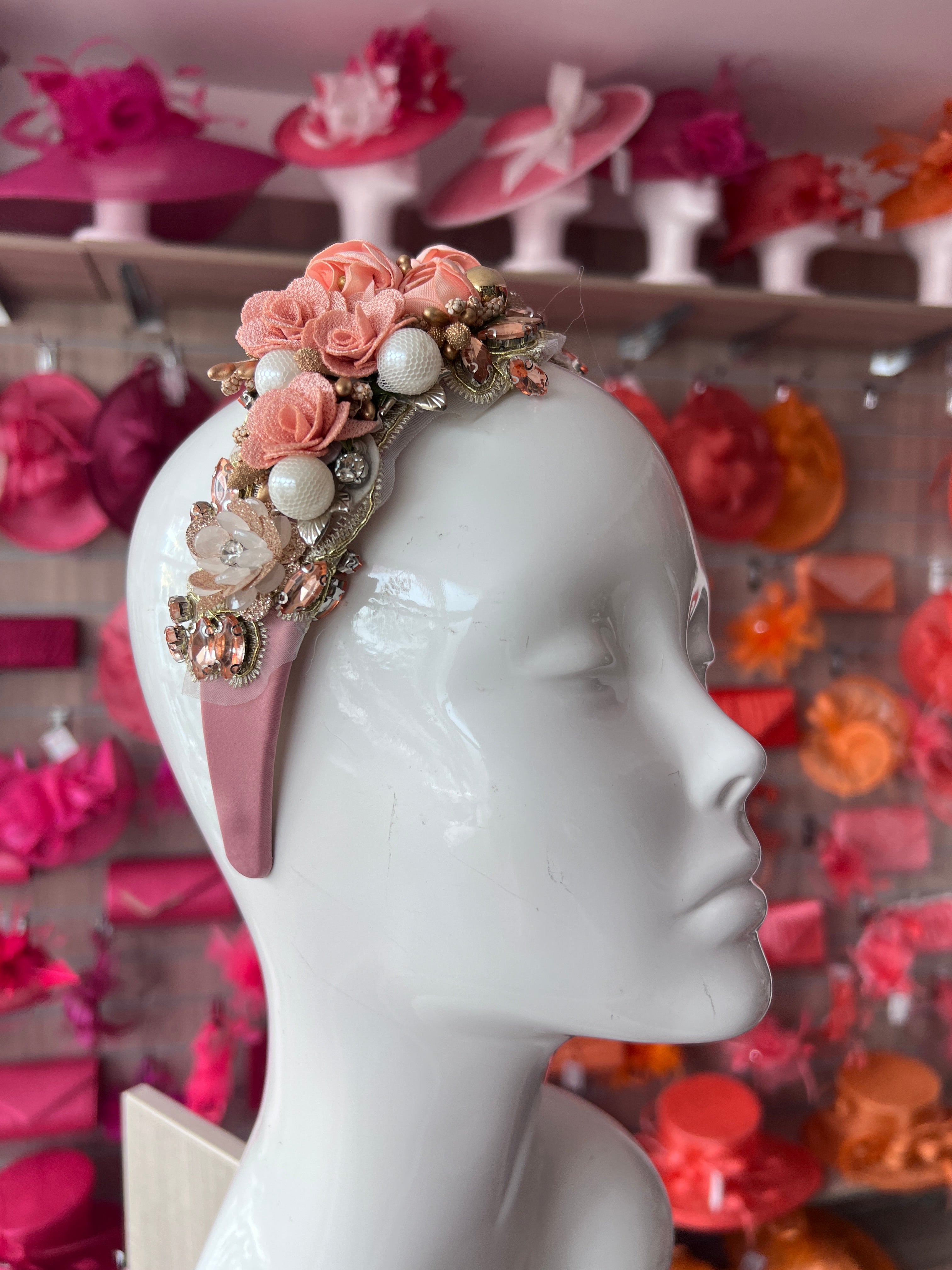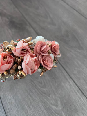 Beautiful blush flower headband with gleaming crystals and large faux pearls decorated onto a wide blush pink headband.