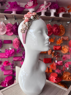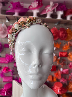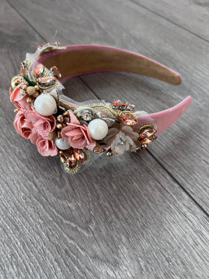 A blush pink floral headband with dazzling crystals that will add some fabulous sparkle to any outfit. Decorated with fabric roses and large faux pearl and diamantes to add some glamour. This unique blush headpiece would be perfect for a bide,bridesmaid or as a special occasion headband for a wedding or prom.
