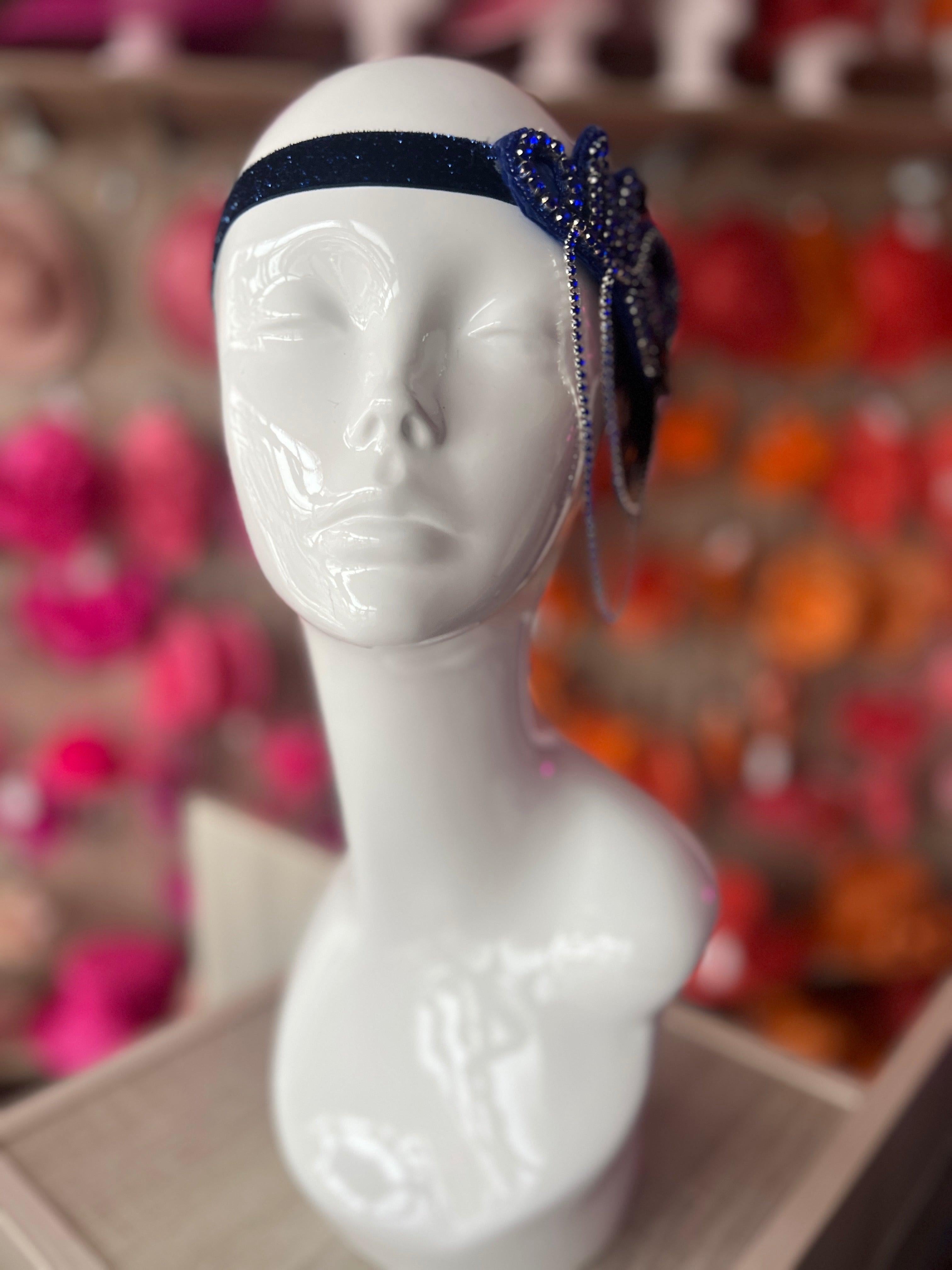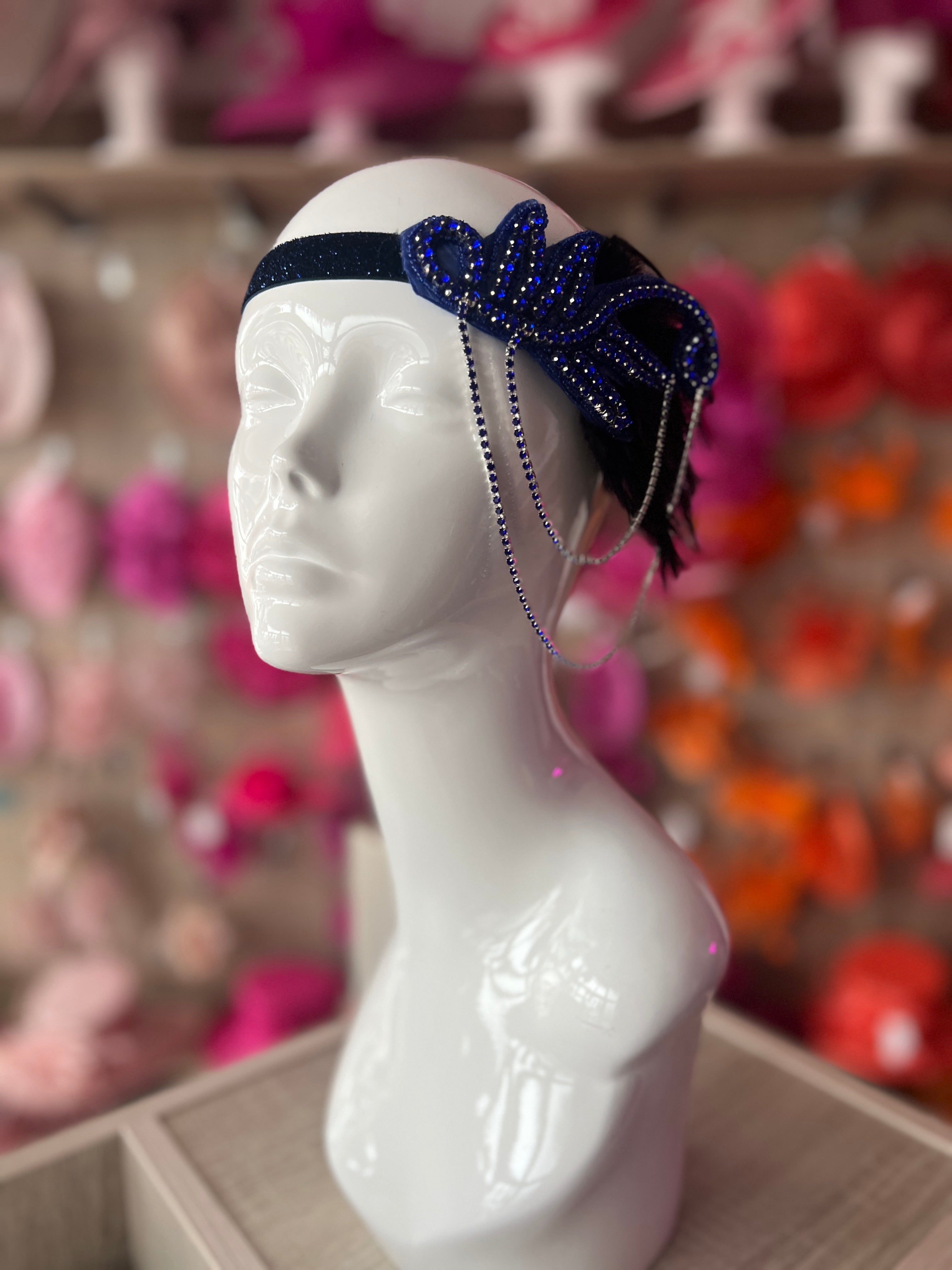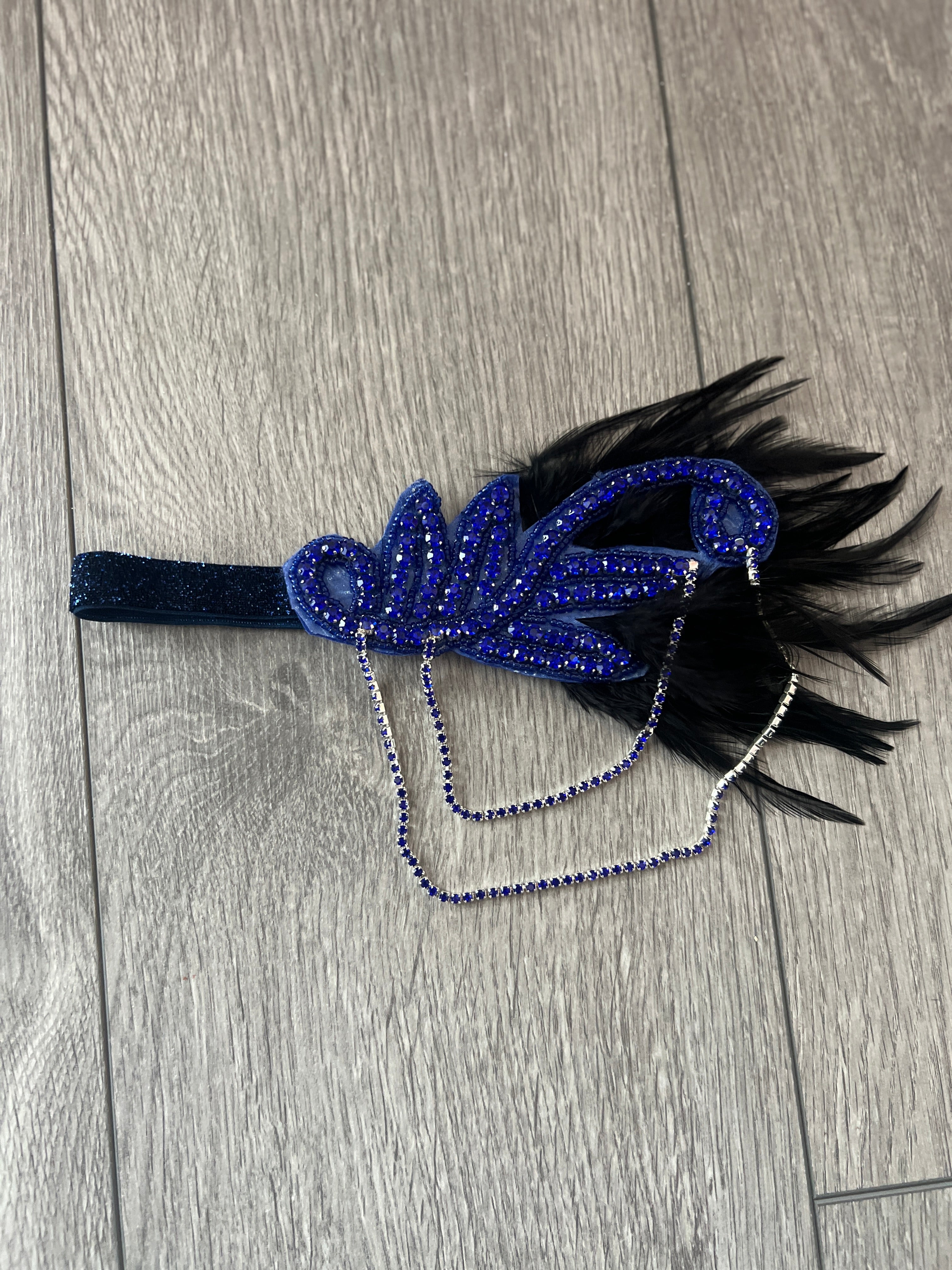 A stunning vintage flapper headpiece made with black feathers mounted on a black elastic headband with a large cobalt blue beaded embellishment and hanging diamantés.