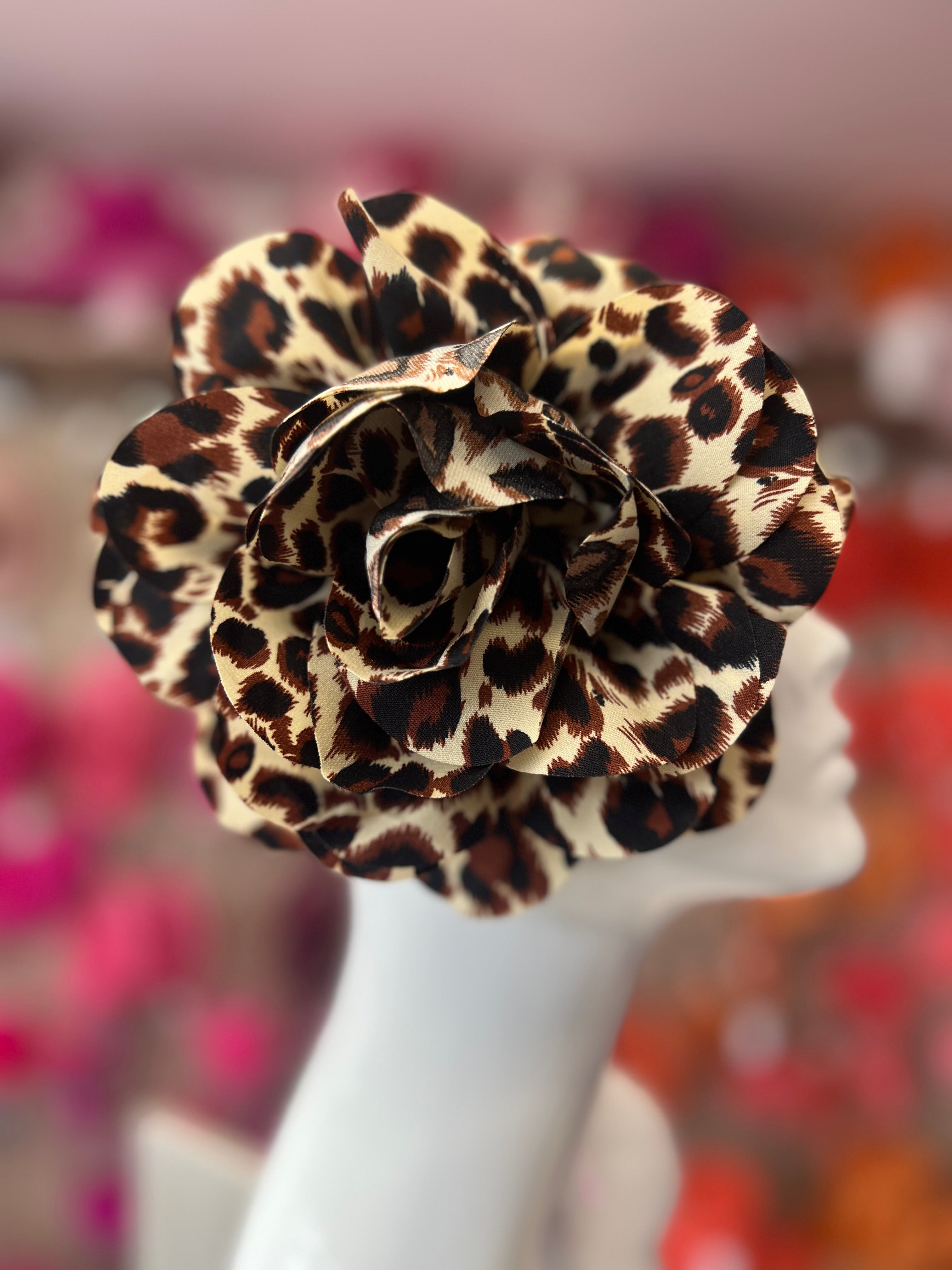 An elegant leopard print large rose fascinator to add some glam to your outfit. Fabulous addition to wear at weddings, ascot races and any other special occasion.