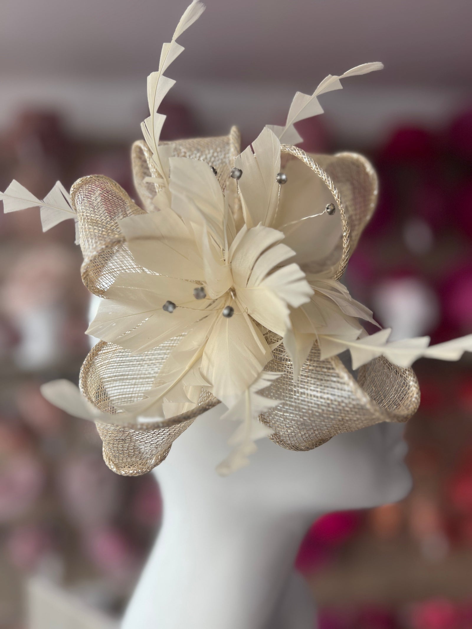 Understated and simple our natural hair fascinators are an all year round essential which will look stunning with a nude, beige or cream wedding outfit.
