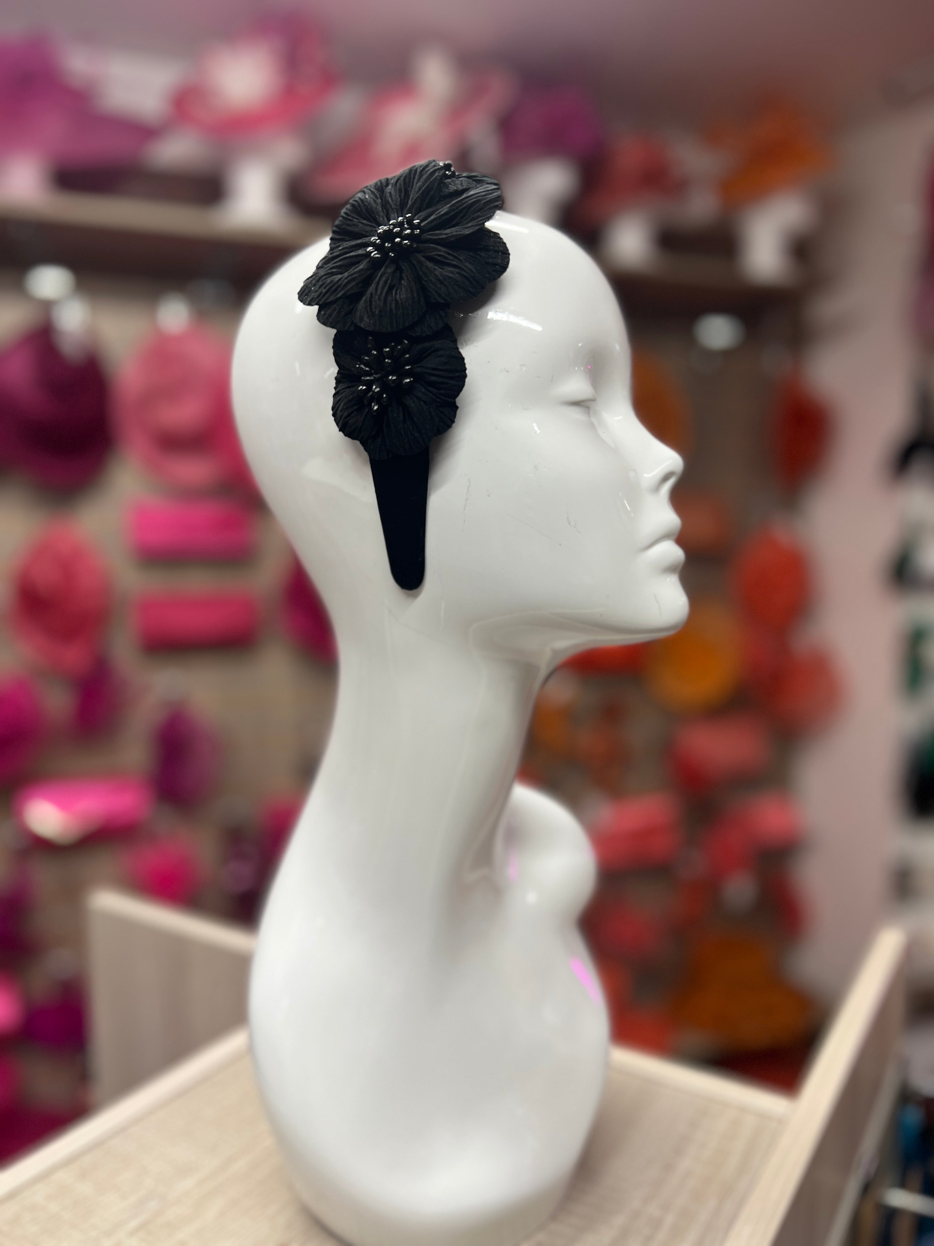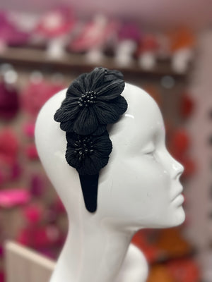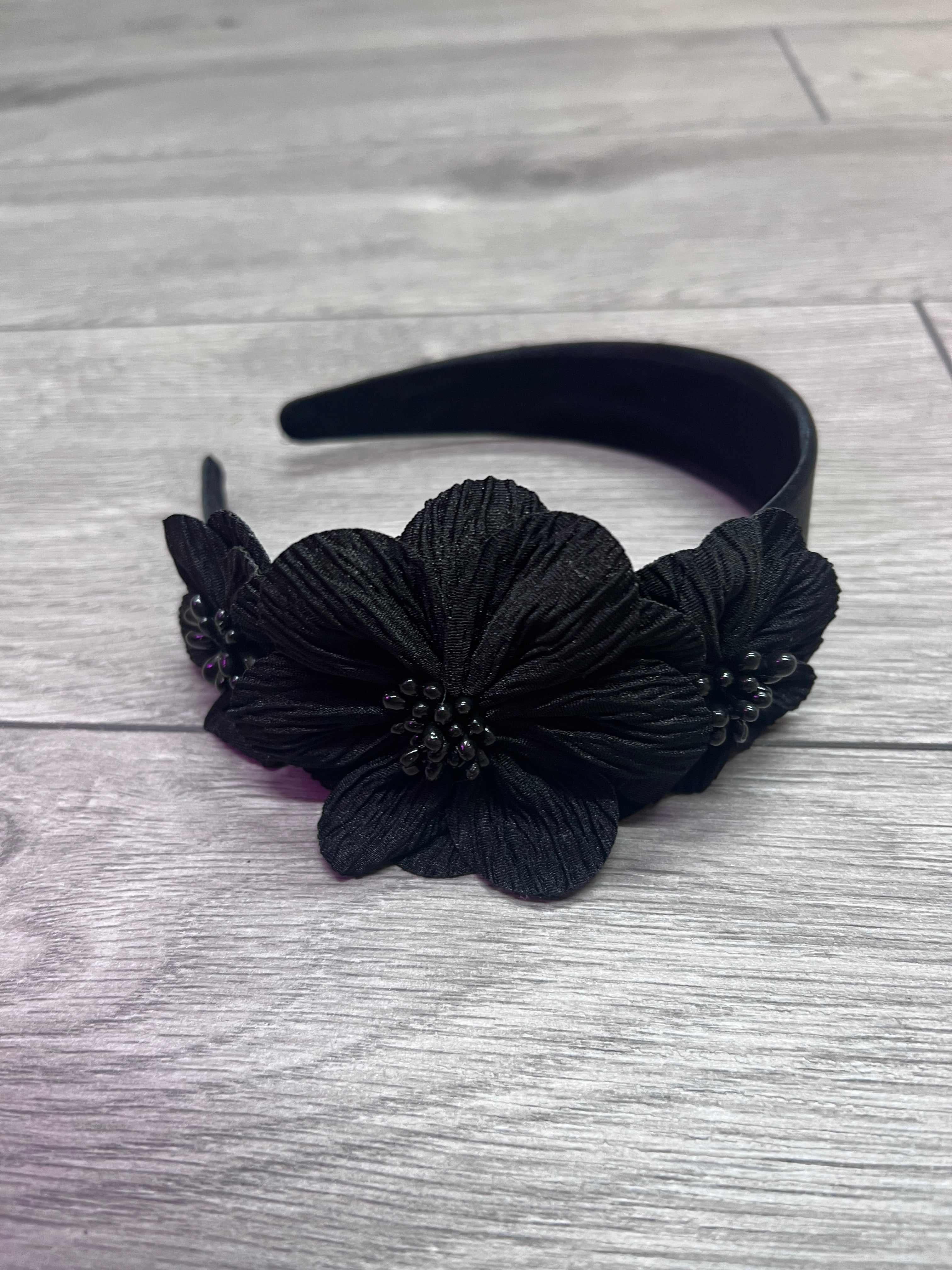 This black trio flower headband adds a refined glamour to your look. Adorned with intricate seed beads in the centre of each flower,it’s a statement piece that blends delicate artistry with festive sophistication. Ideal for weddings, formal events, and holiday celebrations.
