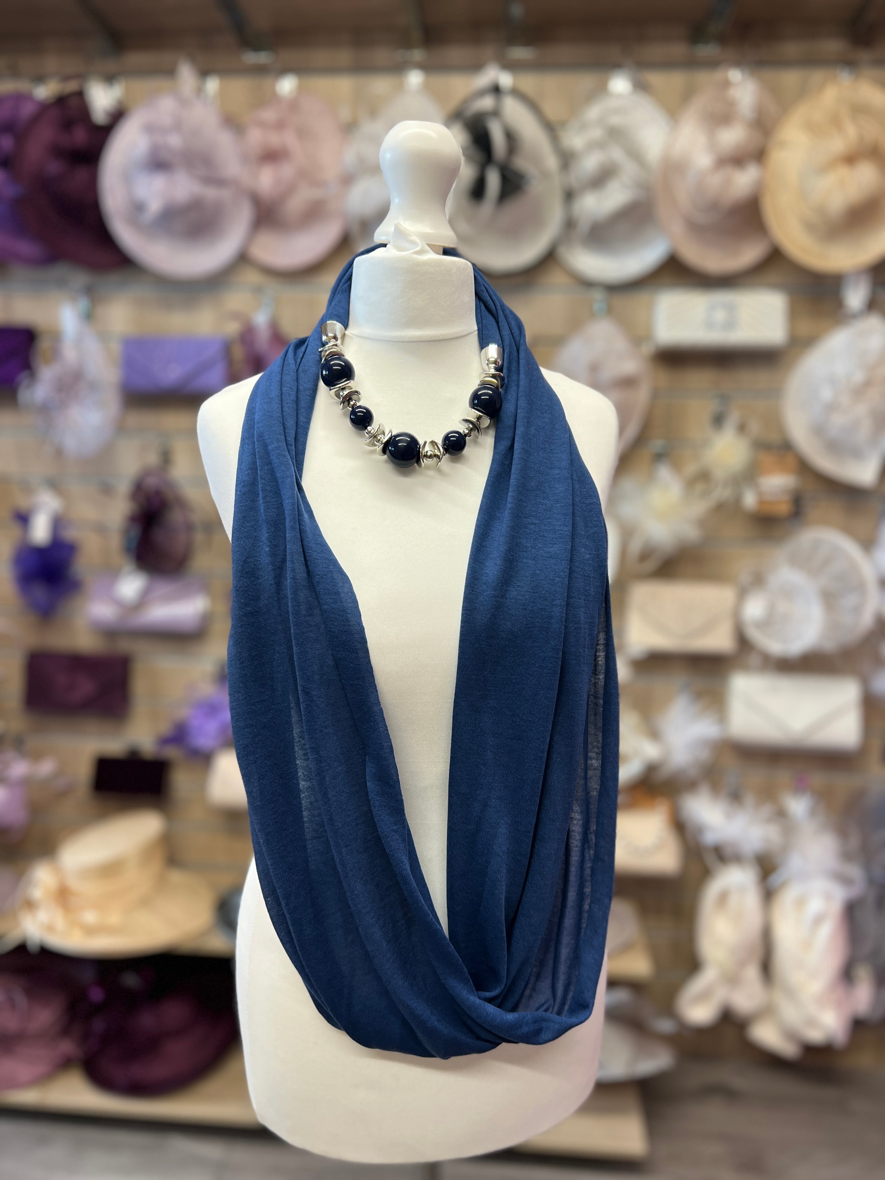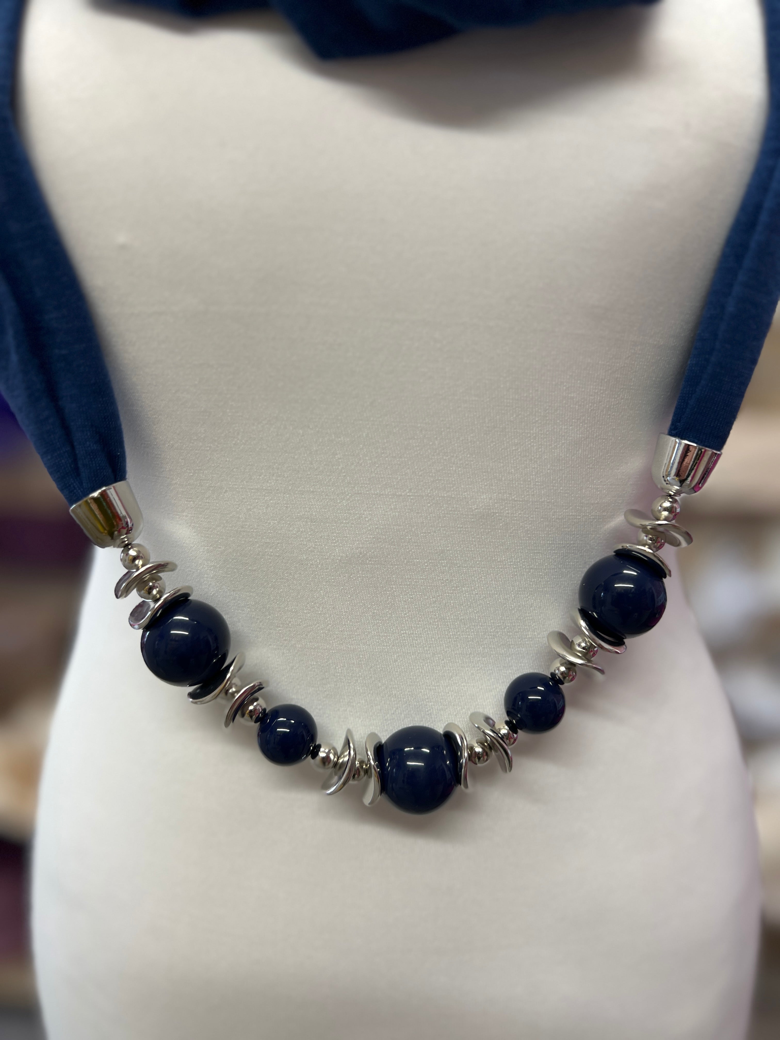This beautiful navy scarf necklace features a one-of-a-kind that will make you stand out in any crowd.
