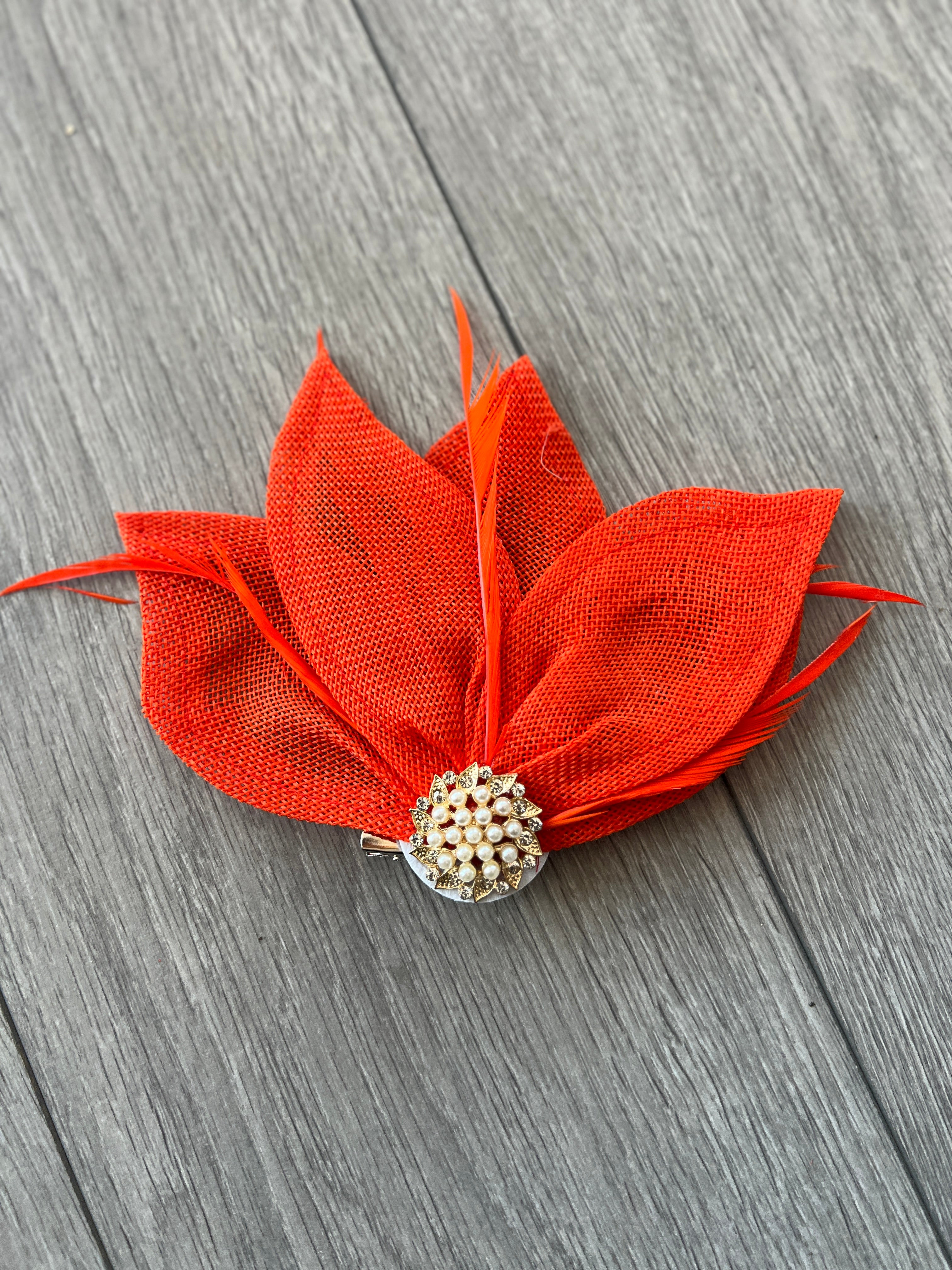 This stunning orange petal fan fascinator is embellished with feathers and a crystal faux pearl embellishment to add some sparkle and glamour.