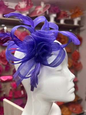 A beautiful purple fascinator designed with fluted crinoline, flowers and loops.This small dark purple hair fascinator can be used for weddings, events and special occasions and is fixed into position with a small hair clip or as an alternative a purple satin headband.
