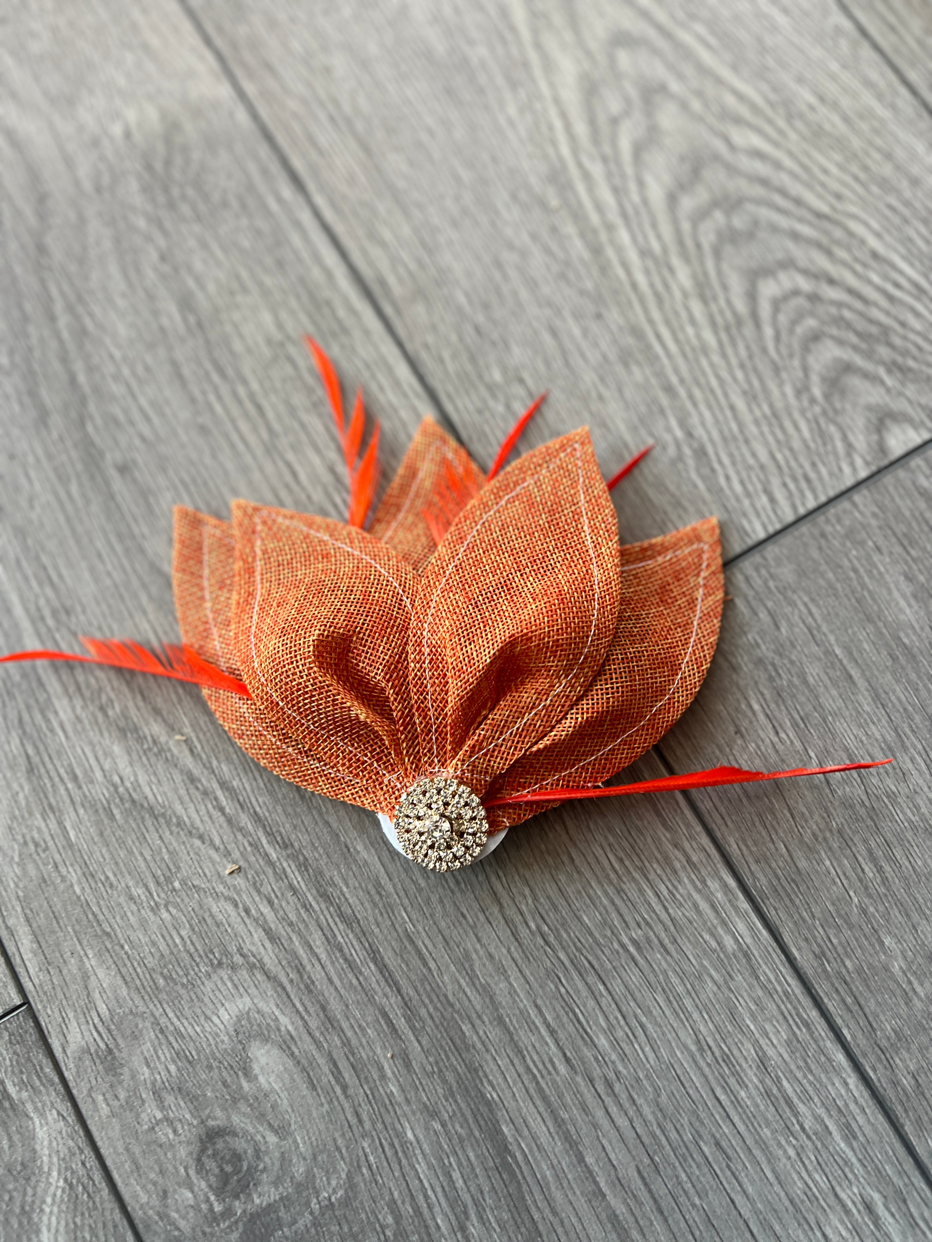 This stunning tangerine petal fan fascinator is embellished with feathers and a crystal diamanté embellishment to add some sparkle and glamour.