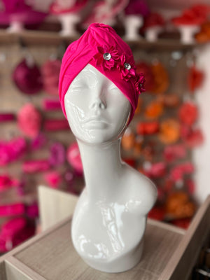 This beautiful fuchsia turban hat with 3 satin flowers which have a diamanté set in the middle of each flower is made of satin soft fabric which is 100% polyester perfect hair protection and comfort.