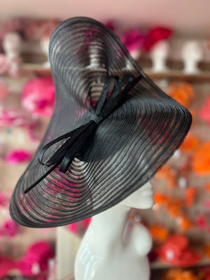 Statuesque and elegant, this large black hatinator is simply divine! Crafted with a stitched crin fabric base, which has been expertly shaped into a uniquely styled headpiece.