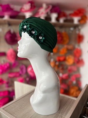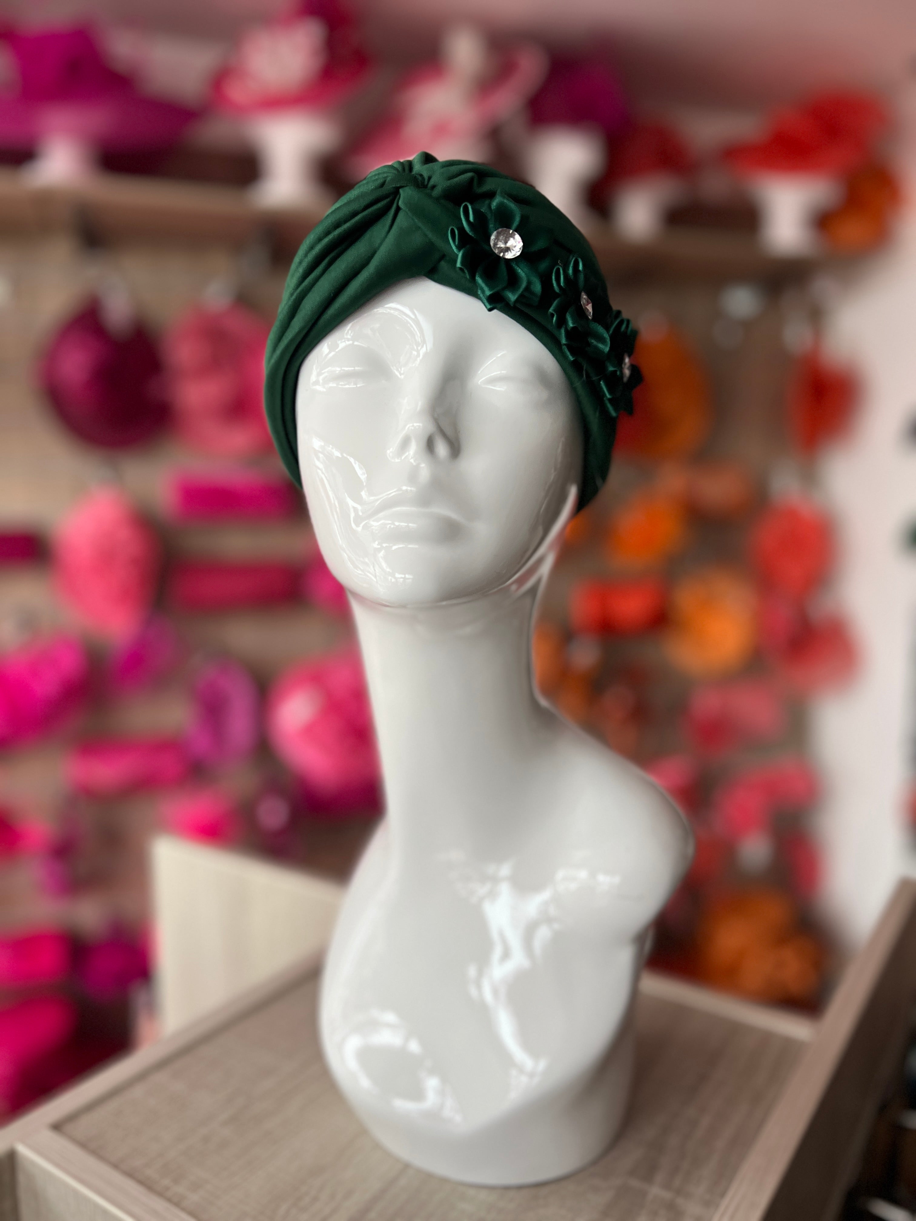This beautiful emerald green turban hat with 3 satin flowers which have a diamanté set in the middle of each flower is made of satin soft fabric which is 100% polyester perfect hair protection and comfort.