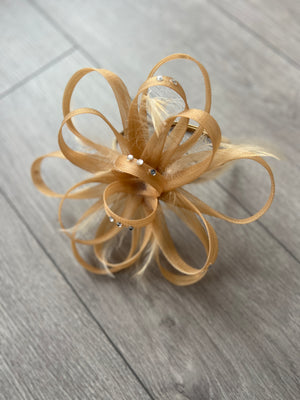 A fabulous fascinator which can be worn with either a headband or clip. this gold fascinator will be a lovely finishing touch to your occasion outfit making it perfect for weddings, events or derby day at the races.