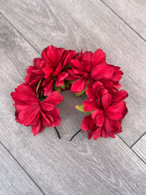 A beautiful peony flower crown headband decorated with four large burgundy peony flowers which are mounted onto a black headband to form this stunning flower hair garland.