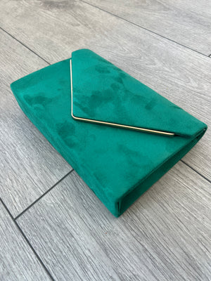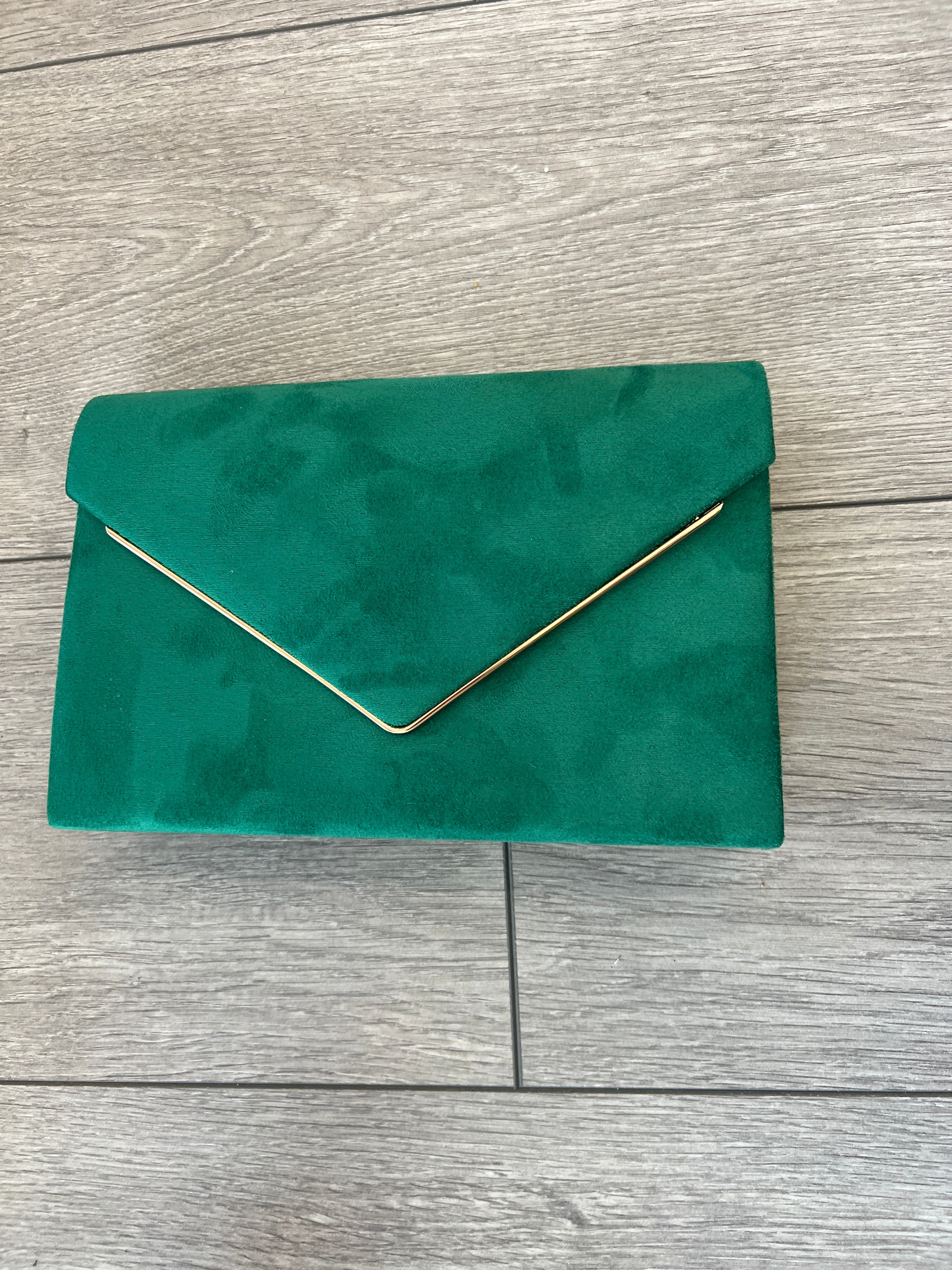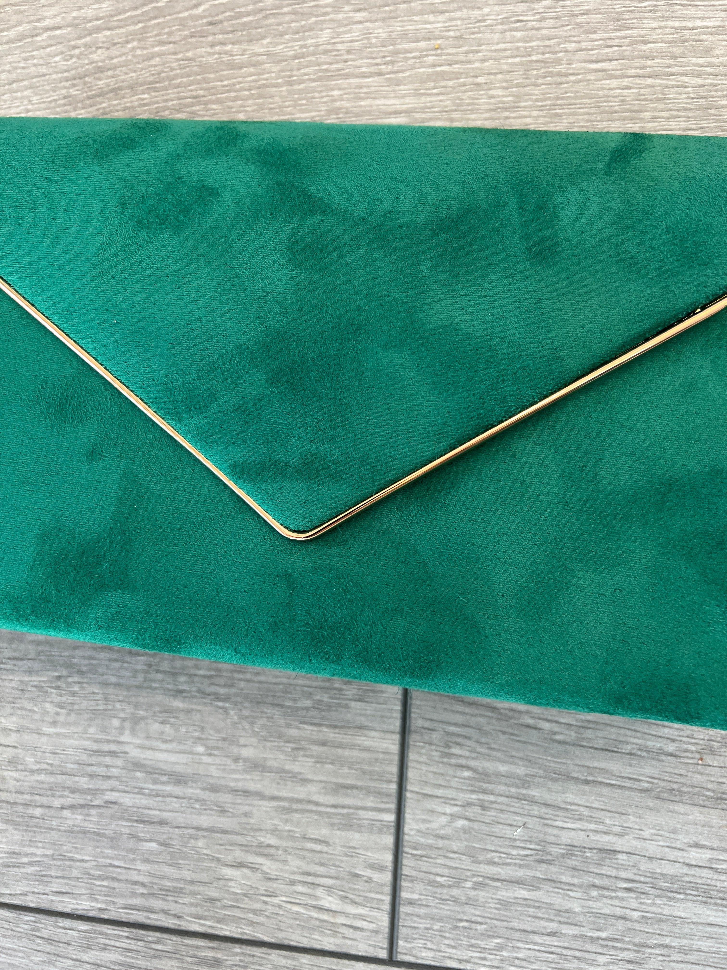 Get a chic new look with this emerald velvet clutch bag with gold trim designed for special occasions and weddings. Styled with emerald green soft velvet, this classy emerald clutch bag also includes a useful detachable chain shoulder strap.