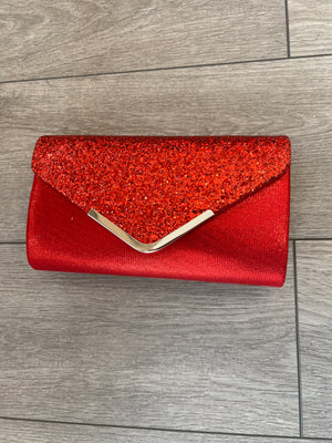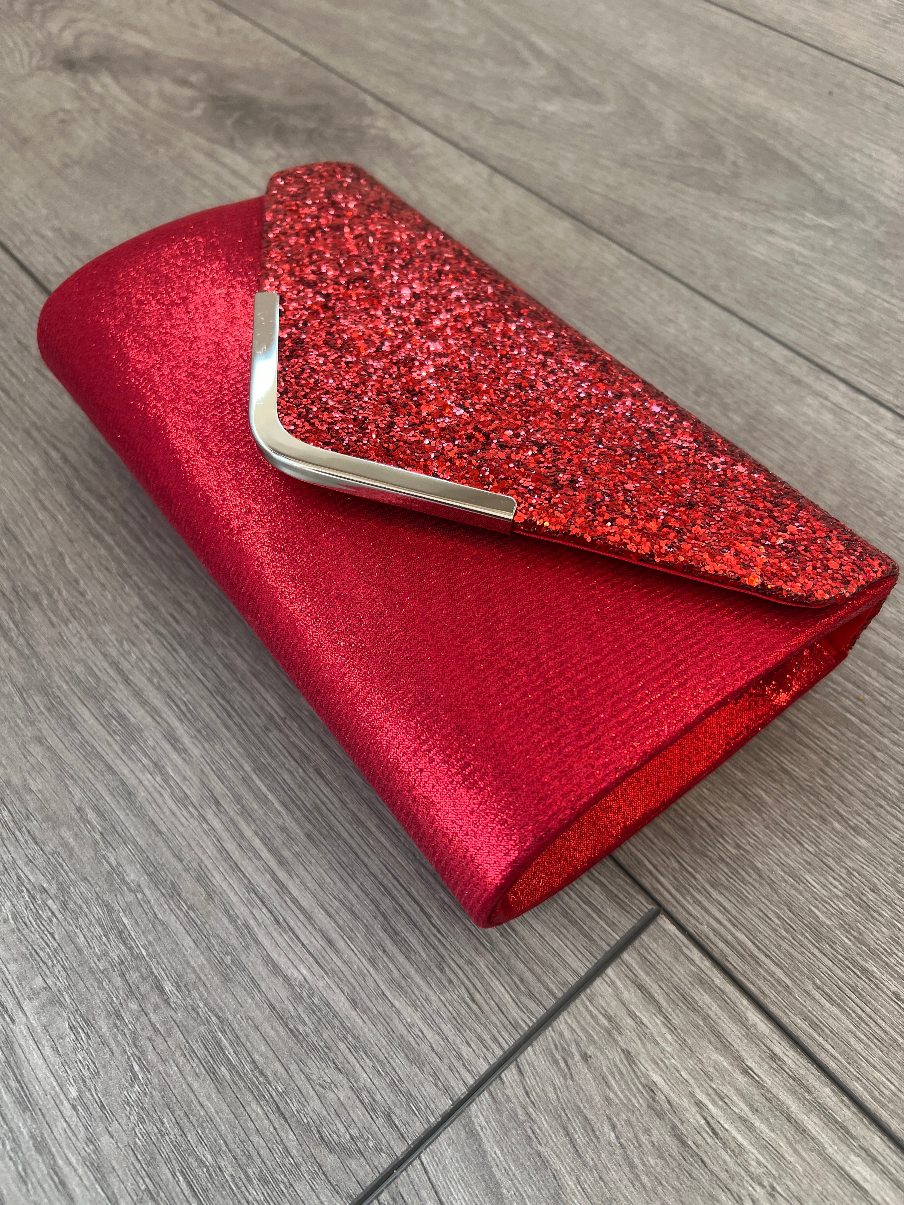 Perfect for that statement finish, this stylish red clutch bag is decorated with glitter and comes with a chain shoulder strap.