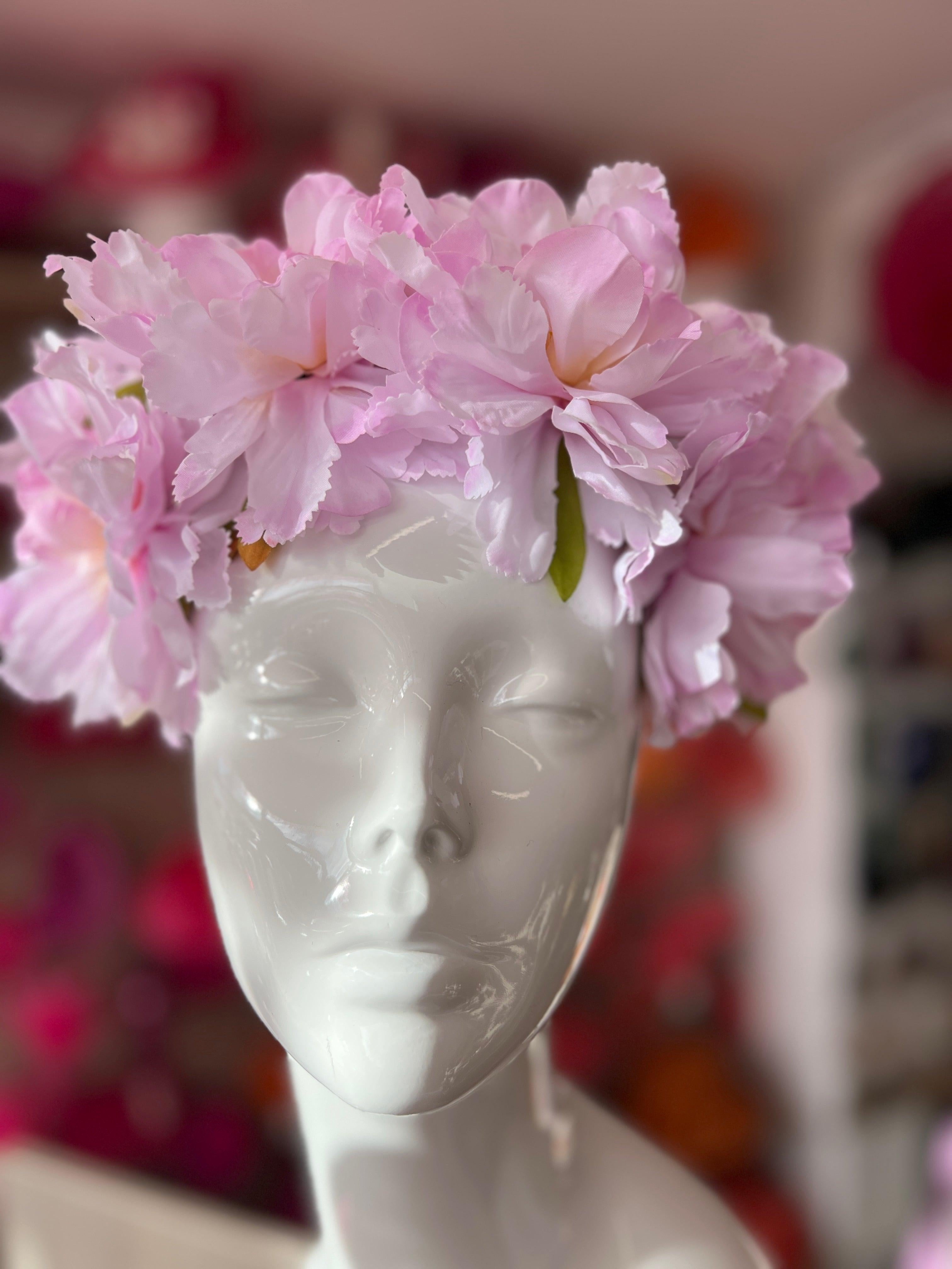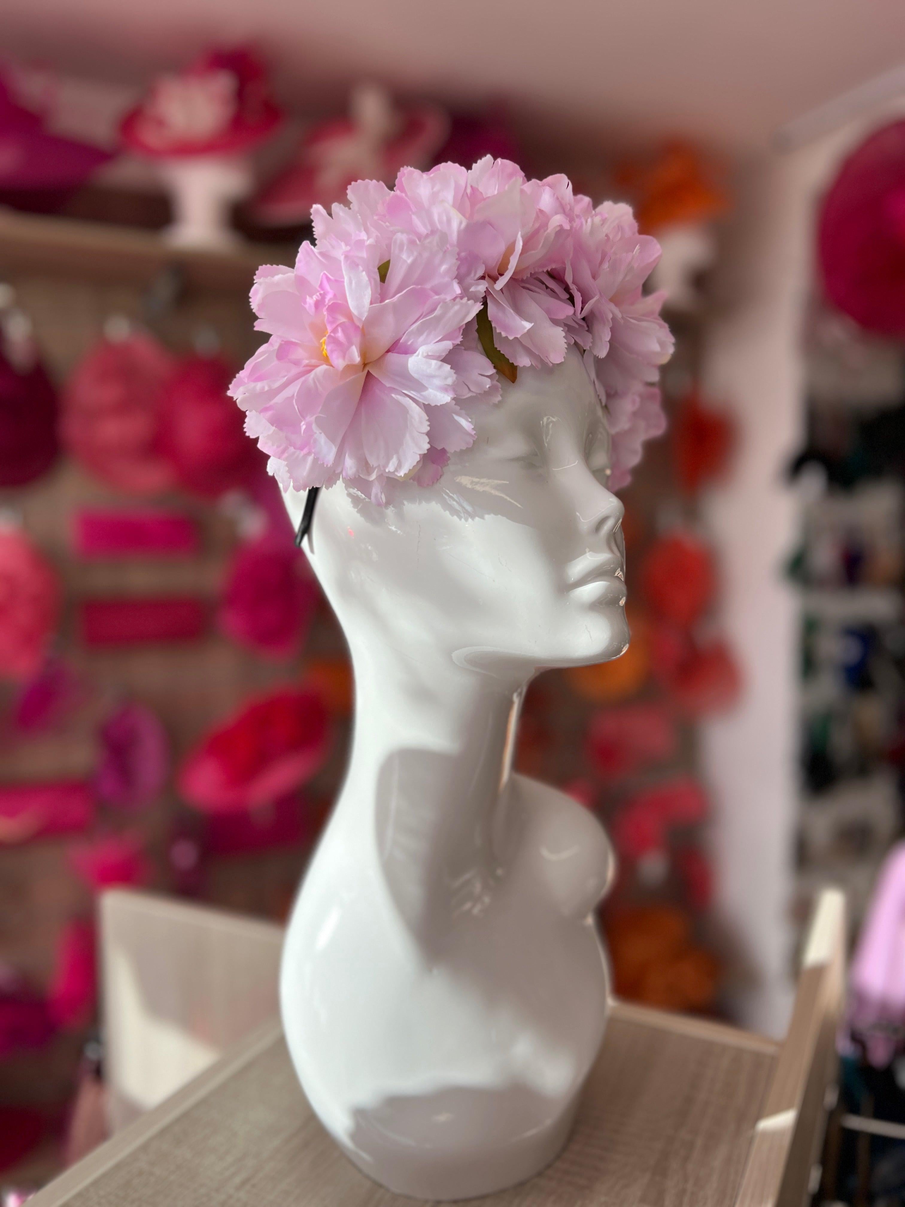 A beautiful peony flower crown headband decorated with four large lilac peony  flowers which are mounted onto a black headband to form this stunning flower hair garland.