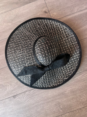 Add a bit of glamour and sophistication with this black and champagne hatinator. The circular base has a simple sinamay bow which is paired with a patterned mesh overlay adding more luxury to this divine headpiece.
