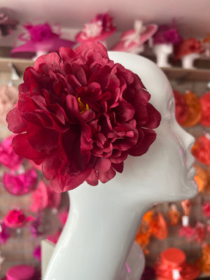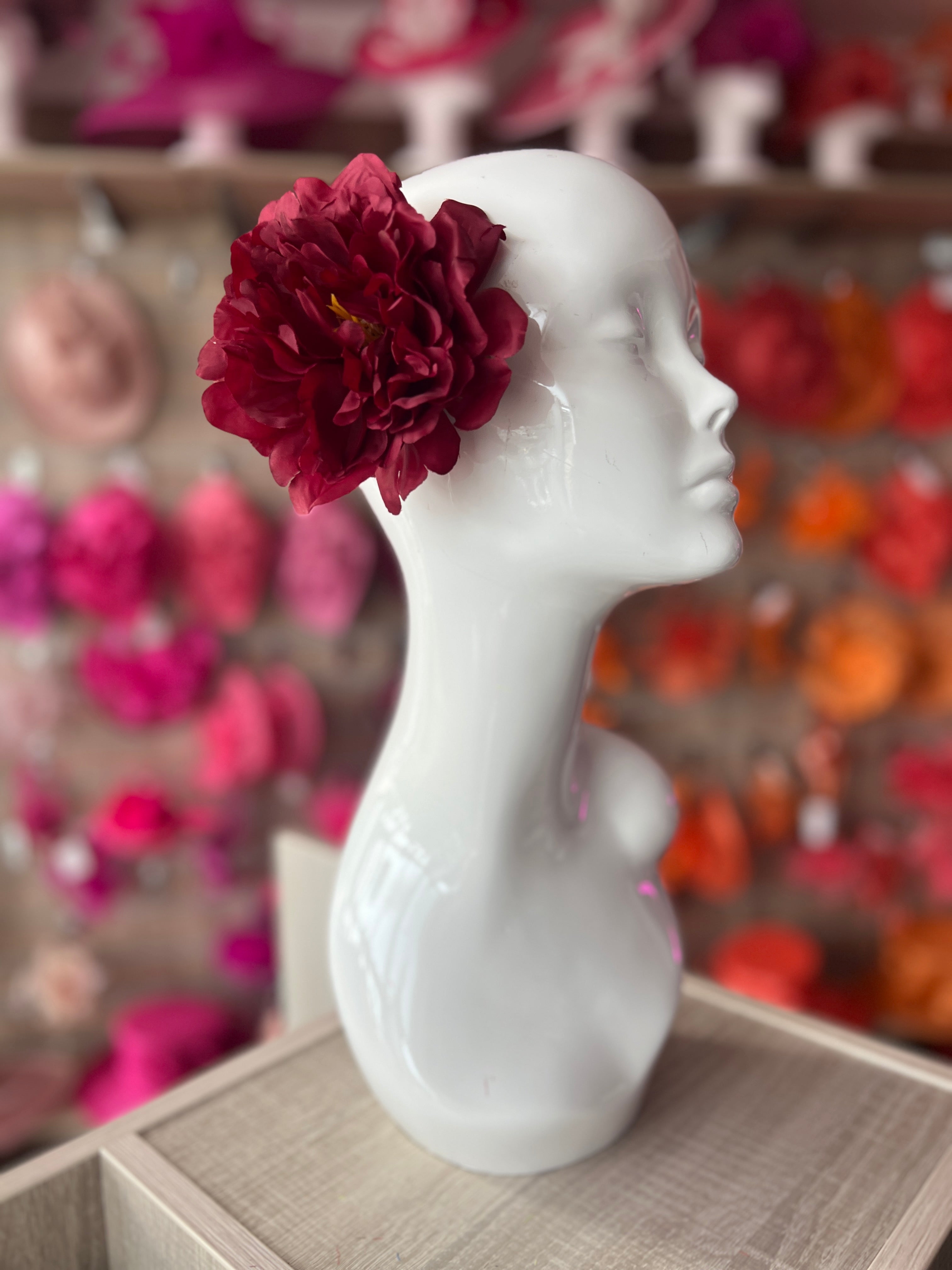 A stunning burgundy flower hair clip in a delightful peony design made with lightly flocked petals and yellow stamens.