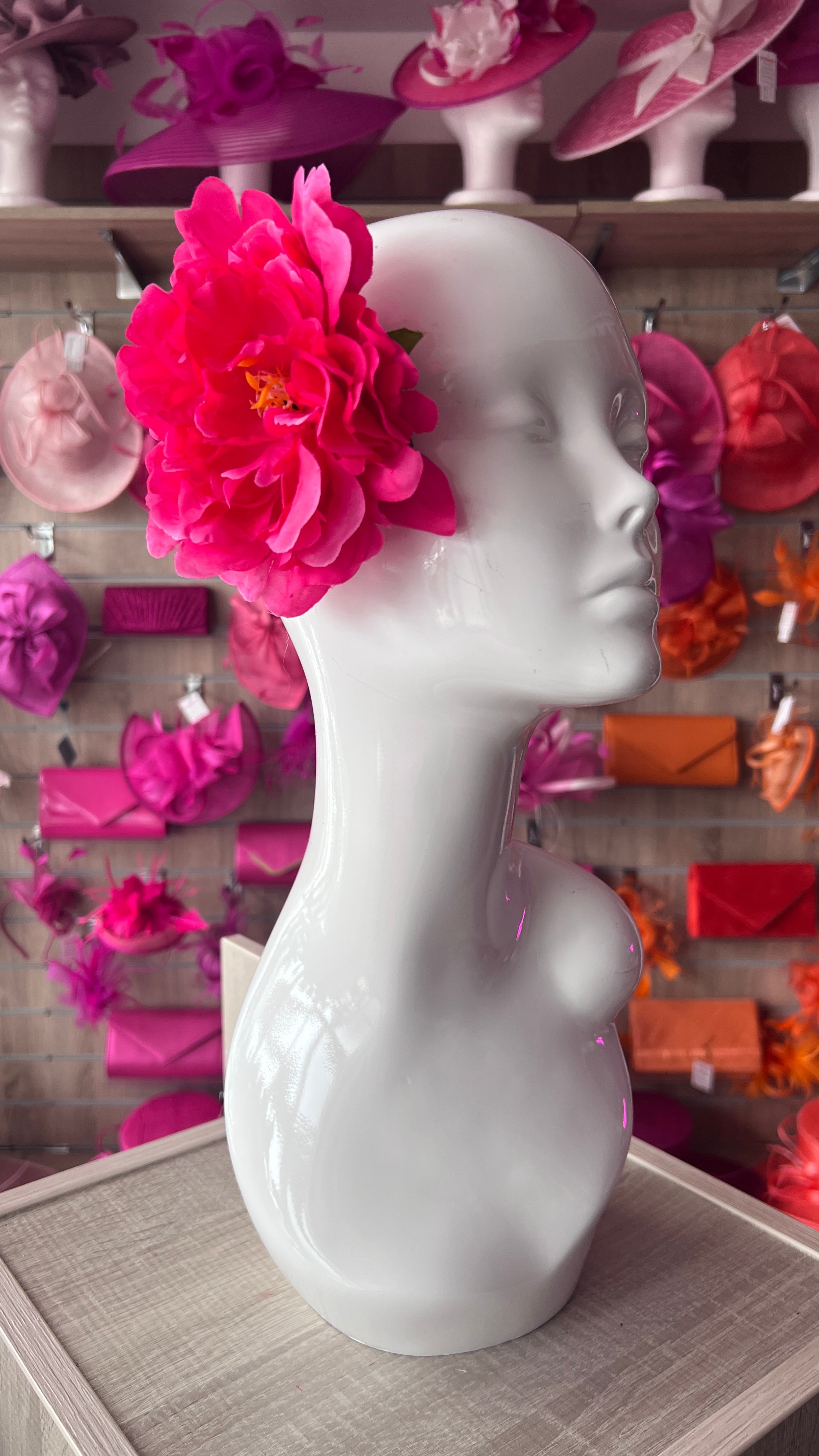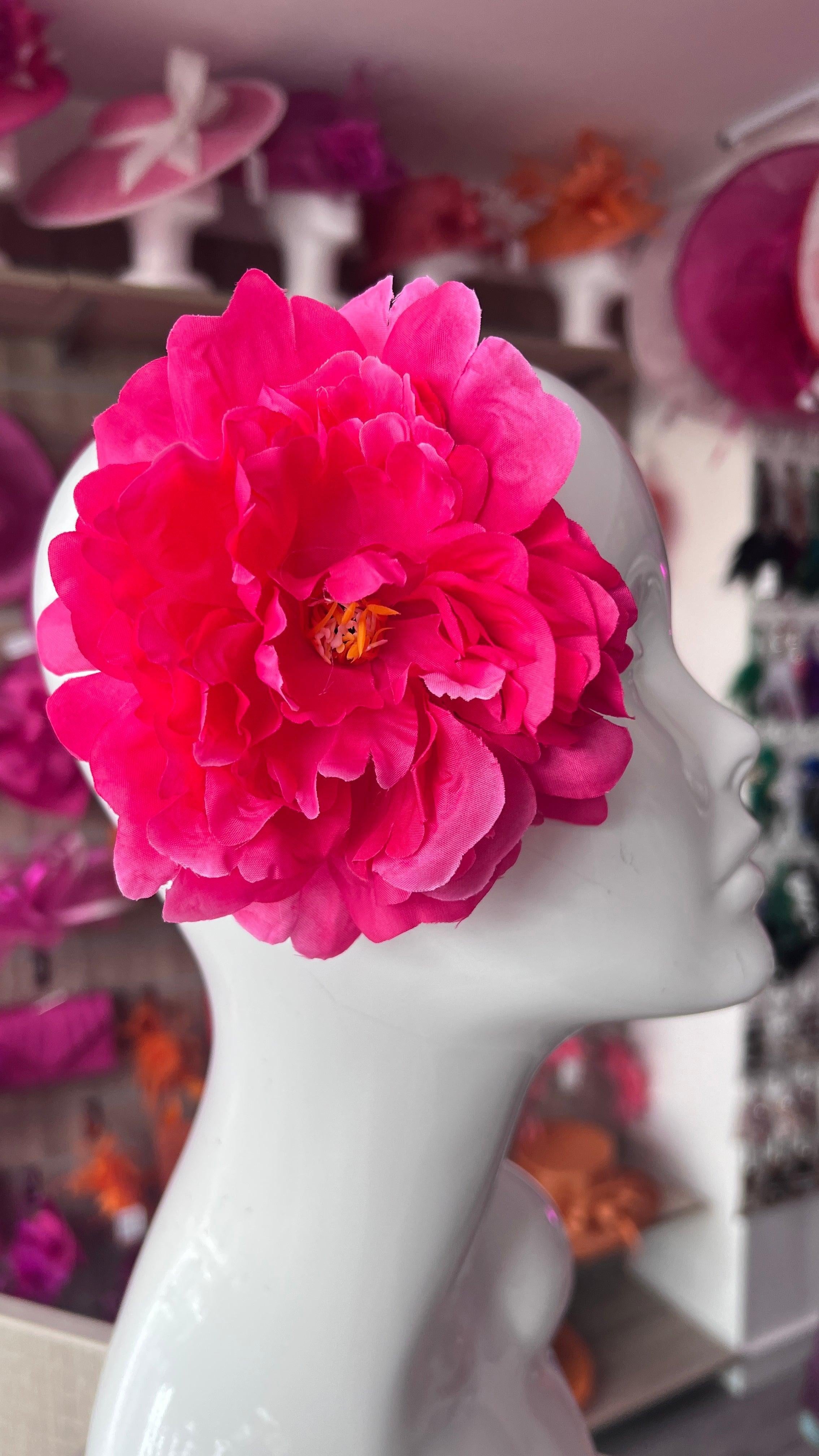 A stunning pink flower hair clip in a delightful peony design made with lightly flocked petals and pink stamens.