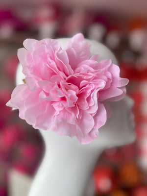 A stunning pink flower hair clip in a delightful peony design made with lightly flocked petals and pink stamens.