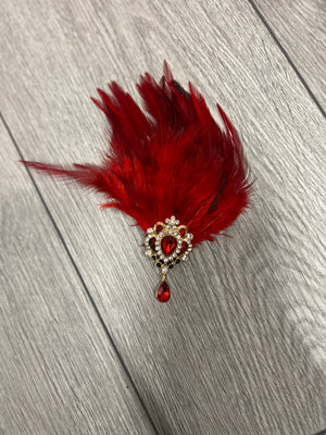 Taking inspiration from the Gatsby era, this pretty vintage style red feather fascinator clip can be worn as an alternative to flapper headpiece or fascinator and is made from decorative red feathers with a diamante embellishment for added sparkle.