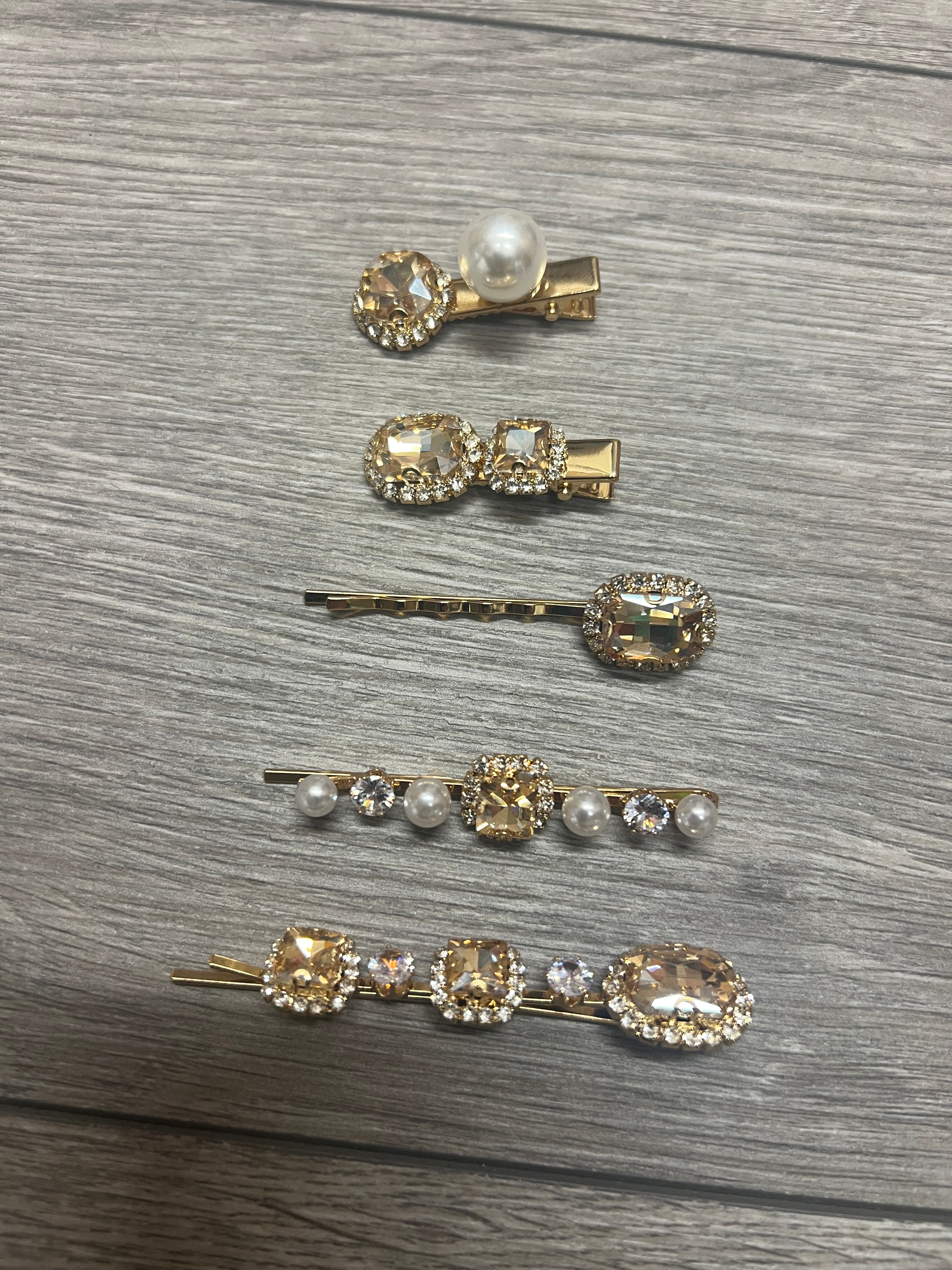Elevate your evening elegance with our gold diamanté rhinestone and pearl hair slides.These exquisite accessories feature a dazzling array of sparkling rhinestones meticulously set to capture the light with every movement. Perfect for weddings, special occasions, or any evening event where you want to make a statement, these hair slides add a touch of sophisticated glamour and ensure your hairstyle shines with effortless grace. Discover the perfect blend of sparkle and sophistication with our diamanté rhinestone hair slides.