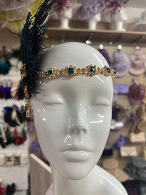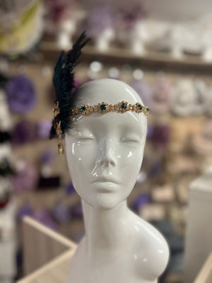If you're looking for something unique for your special occasion, this classy peacock feather flapper fascinator will top your look with style and elegance. Designed with peacock feathers on an elastic band and finished with a vintage jewel green embellishment for added sparkle.