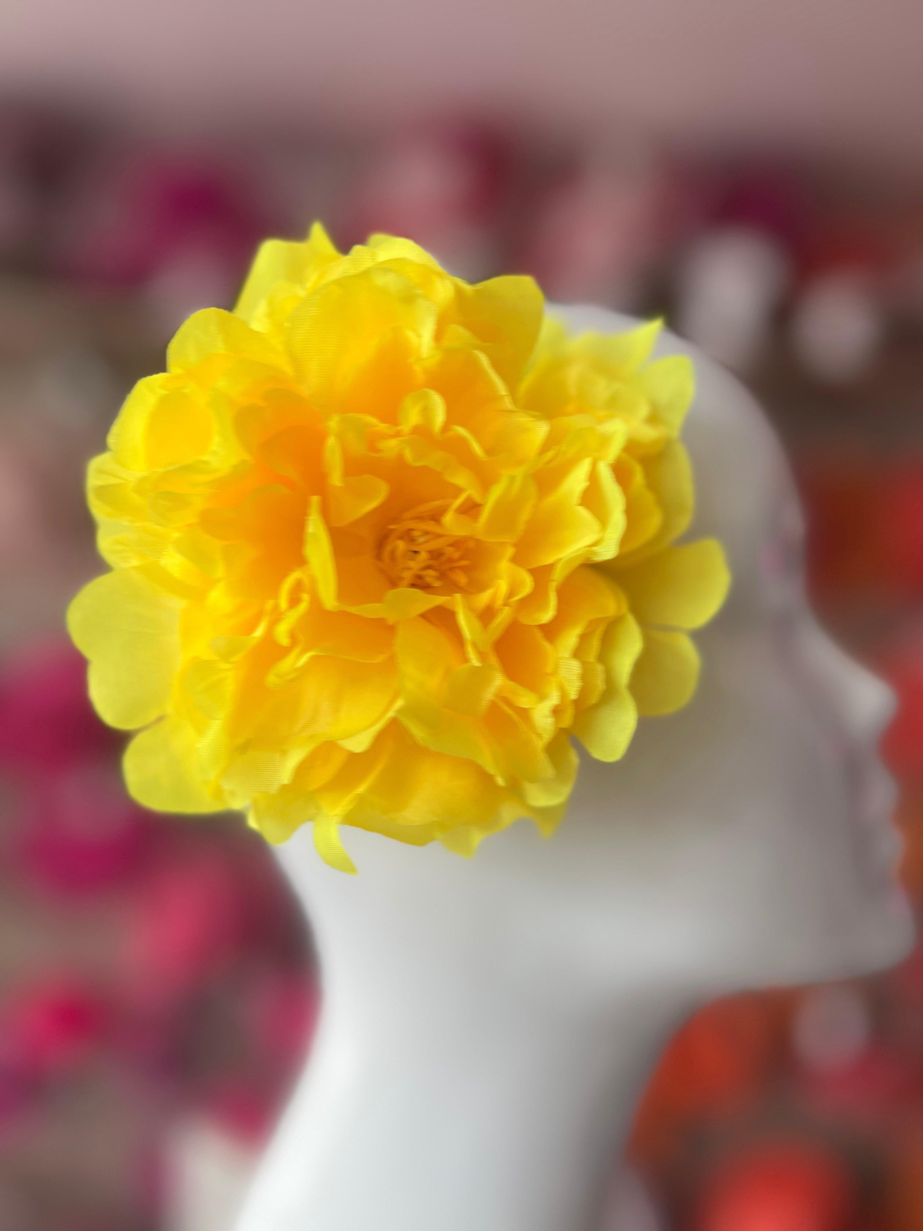 A stunning yellow flower hair clip in a delightful peony design made with lightly flocked petals and yellow stamens.
